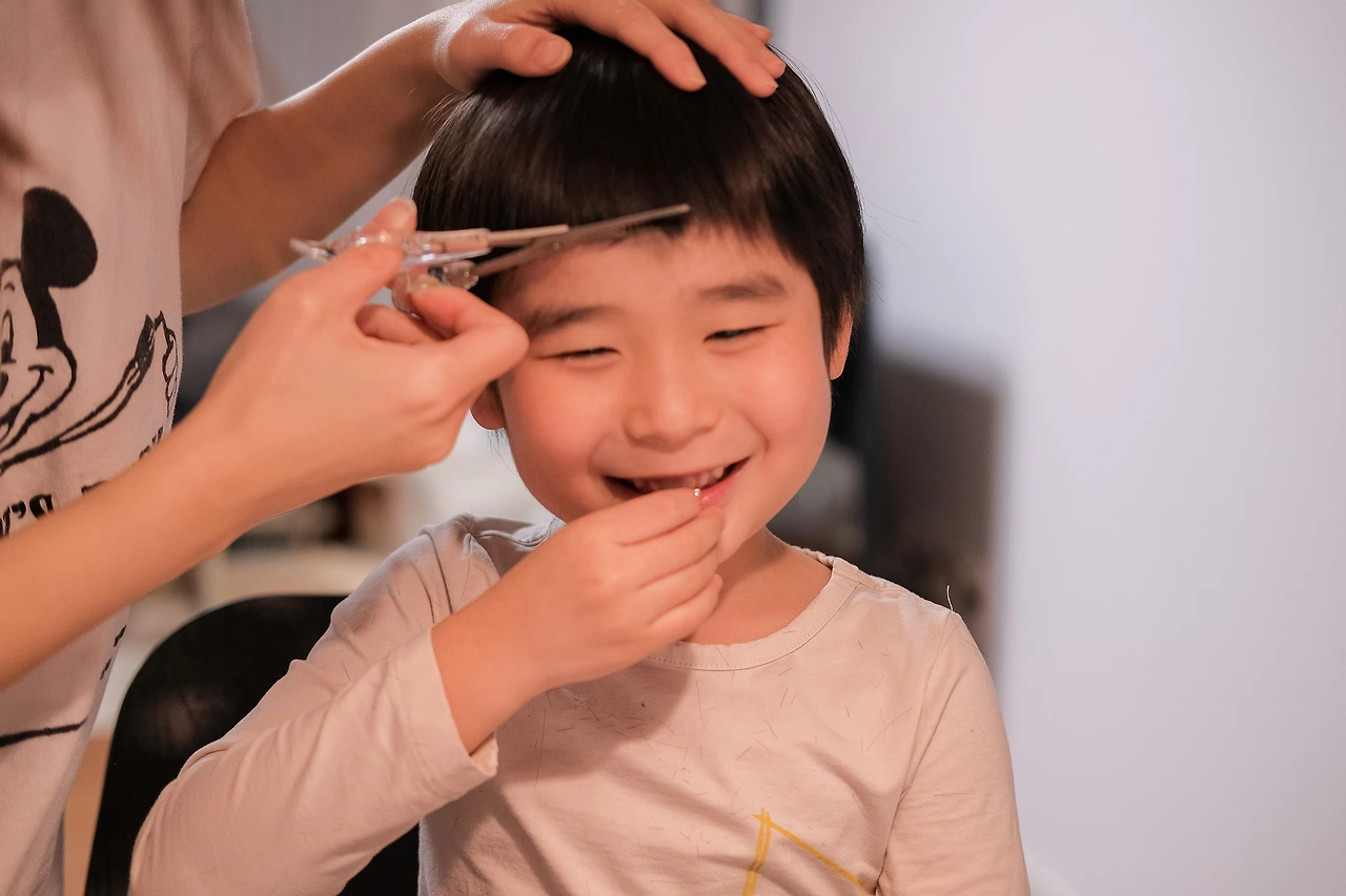 그런데 저녀석의 머릿결은 엄마를 닮아 직모. 그래서 조금만 길어도 눈을 찌른다. 잘라줘야지 마음만 먹다가 어린이집 졸업식도 있고해서 아내가 머리를 다듬어 준다고 나섰다. 이게 어린이집 졸업식 하루 전날의 상황.