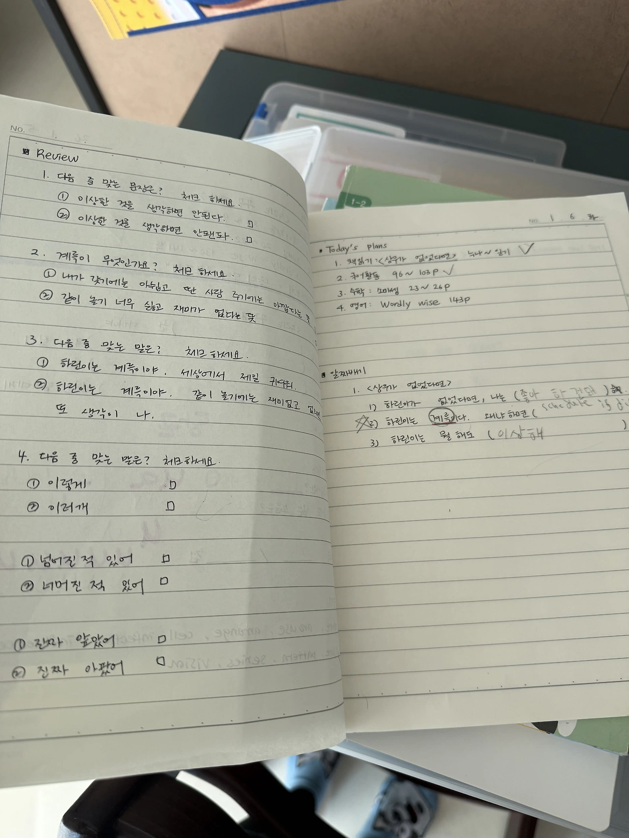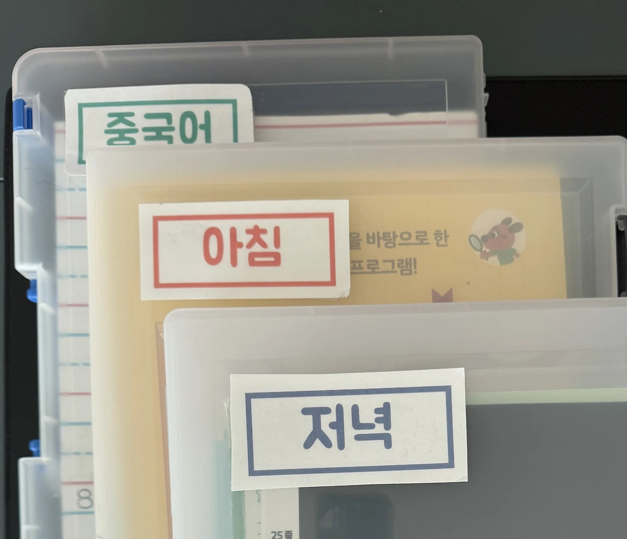 책은 또, 아이의 주의력 문제를 막연히 ‘산만함’으로 보지 말고 사례로 나눠 생각해보라고 조언한다. 언제, 어떤 상황에서 어려움을 겪는지, 그 원인은 무엇인지, 그리고 목표는 무엇인지 정리한 뒤 구체적인 전략을 세우라는 것이다. 그래서 나는 공부를 한꺼번에 관리하려 하지 않기로 했다. 아침 공부, 저녁 공부, 중국어 공부를 각각 다른 클리어 파일에 나눠 담았다. 파일 하나만 들면 바로 시작할 수 있도록 준비 과정을 최대한 줄였다.