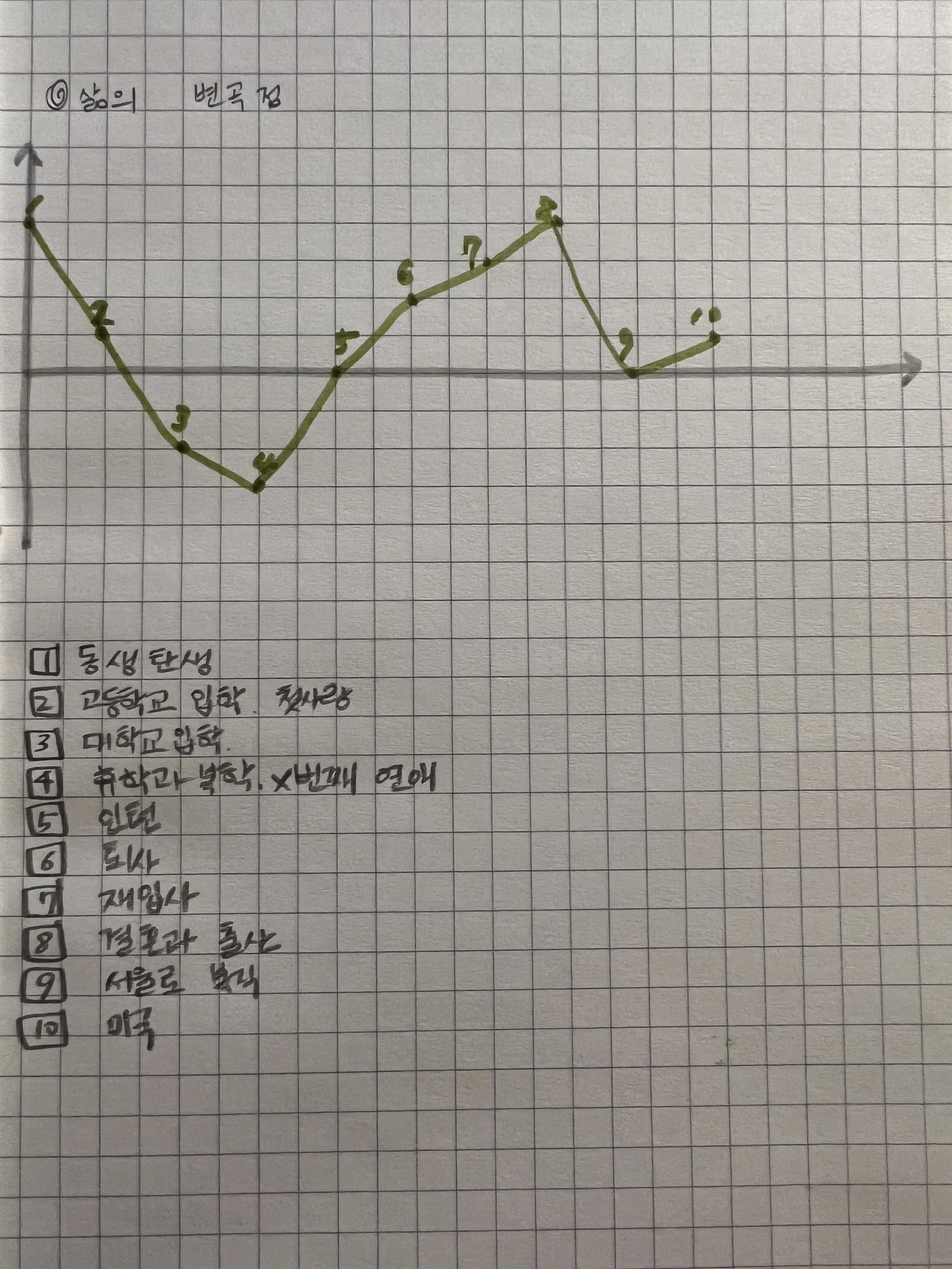 글쓰기 모임에서 내 삶을 변곡점으로 표현해 보라는 주제를 받았다. 흰 종이 위에 가로선을 그어 그 안에 내 인생을 축약해 적어보는 것이다. 아무도 궁금해하지 않을 내 인생. 하지만 나 자신에게는 스스로 증명해 보이고 싶은 것이 많기에, 기꺼이 종이를 꺼내 들었다.