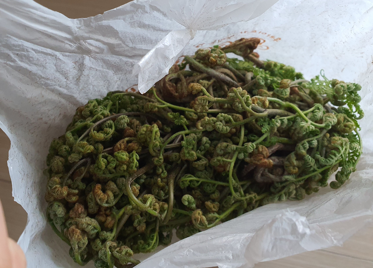 그러면서도 혹시나 고사리가 있을까 싶어 나도 남편처럼 고개를 떨구고 땅을 보며 산길을 걸었다. "어, 자기 여기 고사리 많다." 드디어 고사리가 눈에 들어왔다. 축축한 곳이 아닌, 볕이 잘 드는 곳에 꼿꼿하게 서 있는 고사리가. 얼른 쪼그리고 앉았다. 쪼그리고 앉으니 더 많은 고사리가 눈에 들어온다. 아, 고사리야 너도 쪼그리고 앉아서 자세히 들여다봐야 눈에 띄는 스타일이로구나. 고사리를 신나게 수확했다. 고사리를 수확하는데만 정신이 팔려 한참을 땅만 보며 걸었다. 텅 비었던 비닐 봉다리가 묵직해졌다. 우리 둘은 마주 보며 웃었다.