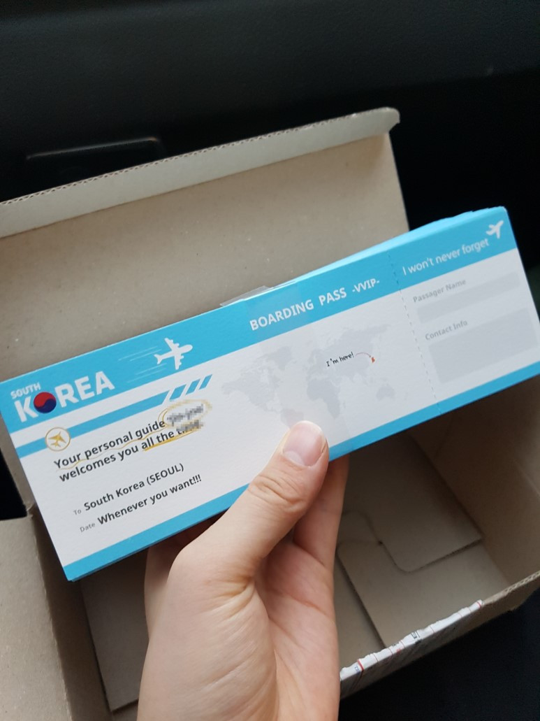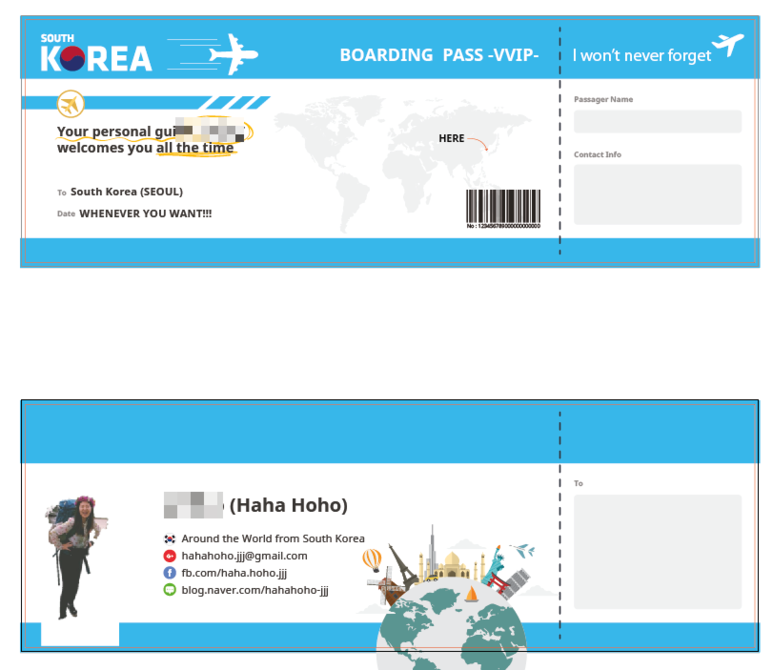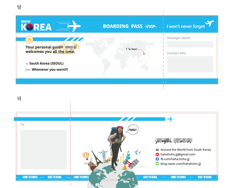 그래서 많은 검색과 구상 끝에 한 블로거의 아이디어에 힌트를 받아서 아래와 같이 기획했다. 그분의 블로그를 예전에 지나가면서 봐서 출처를 기록하지 못하는 게 아쉬운데, 한국에 오라는 초청장 카드 형태로 만들었는데 신선했다. 그래서 나는 비행기 티켓의 형태로 만들어 봐야겠다고 생각했다.