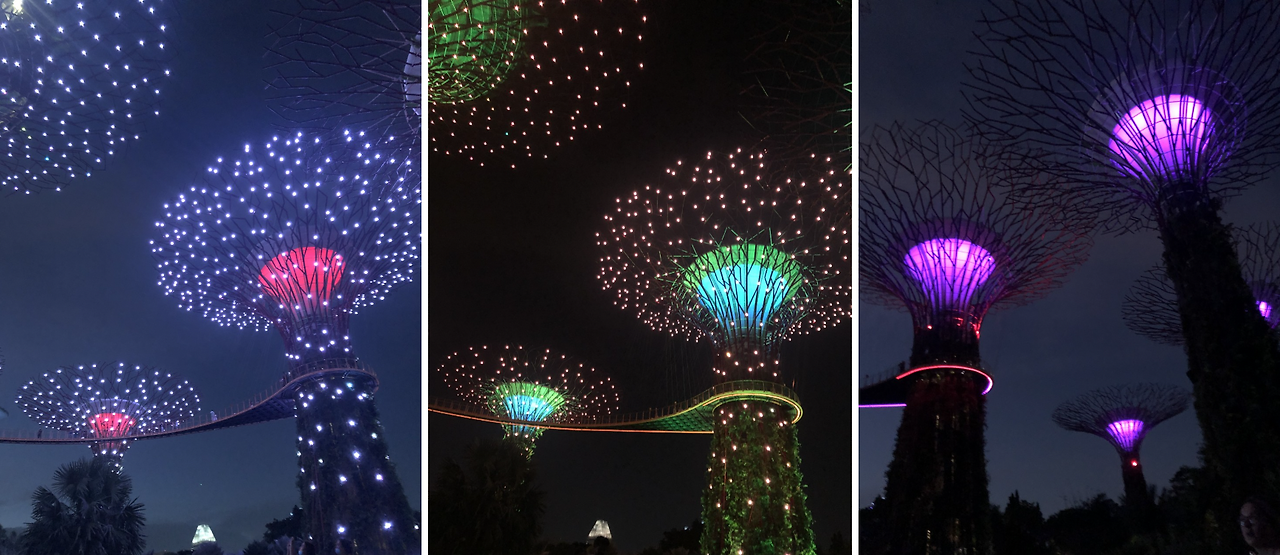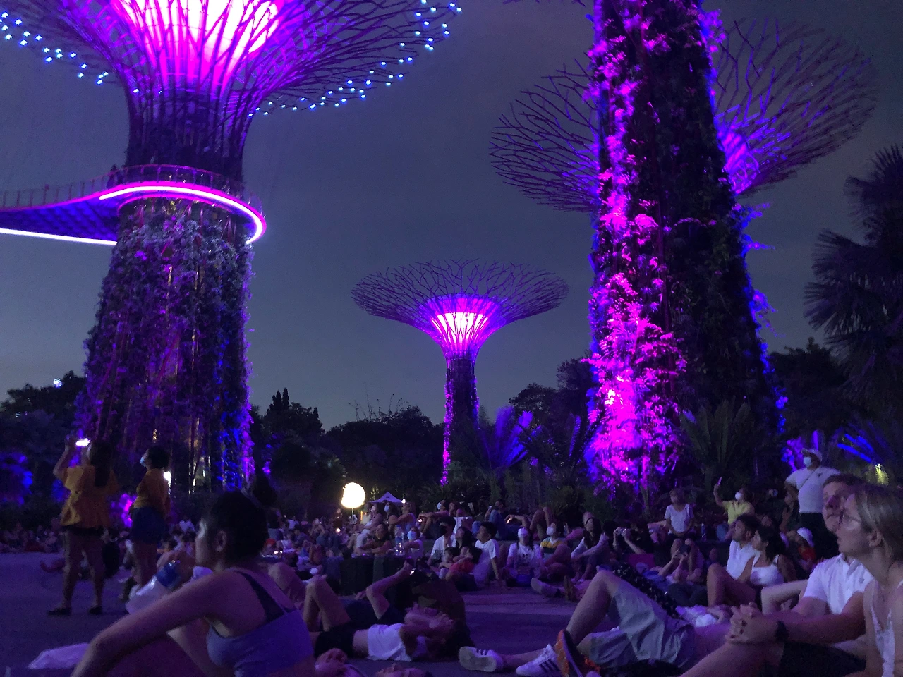 가든스 바이 더 베이의 하이라이트인 라이트&사운드 쇼 ‘랩소디 쇼’. 하늘을 바라보며 빛이 변하는 나무를 감상하는 것이 포인트! 7시 45분부터 8시까지 진행되는데 7시부터 사람이 몰리며 30분이면 자리가 꽉 찰 정도로 여행자들이 많이 몰려든다.