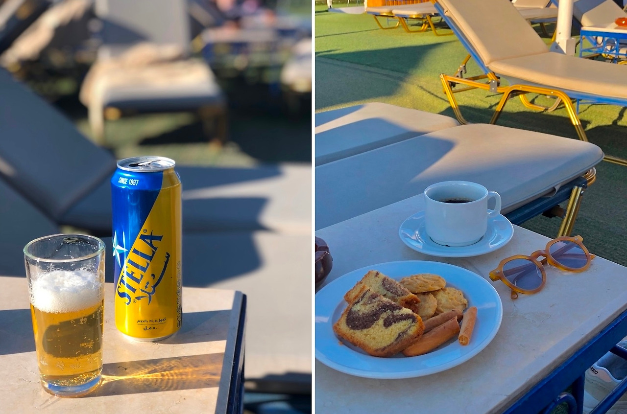 선베드에 누워 마시는 커피와 맥주! 이집트 맥주 스텔라는 110LE. (약 4.5달러) 크루즈에서 사 먹으면 비싸다고 해 걱정했는데, 여행 왔으니 기분 좋게 마셔본다.