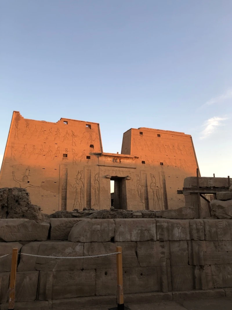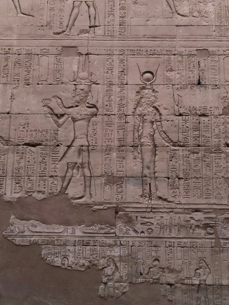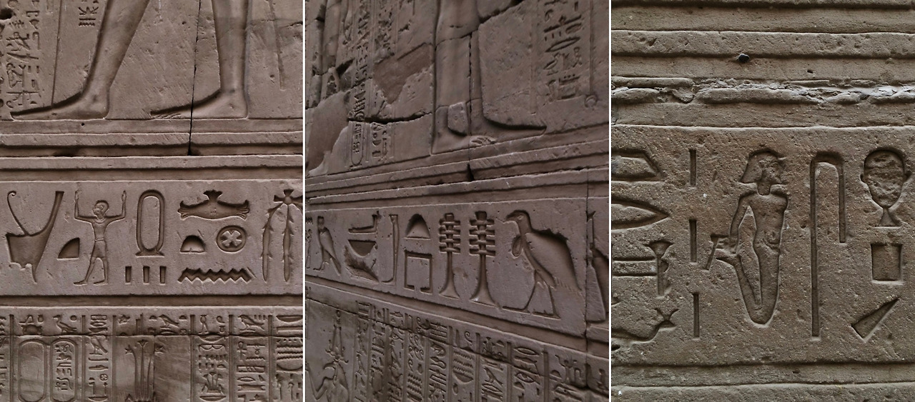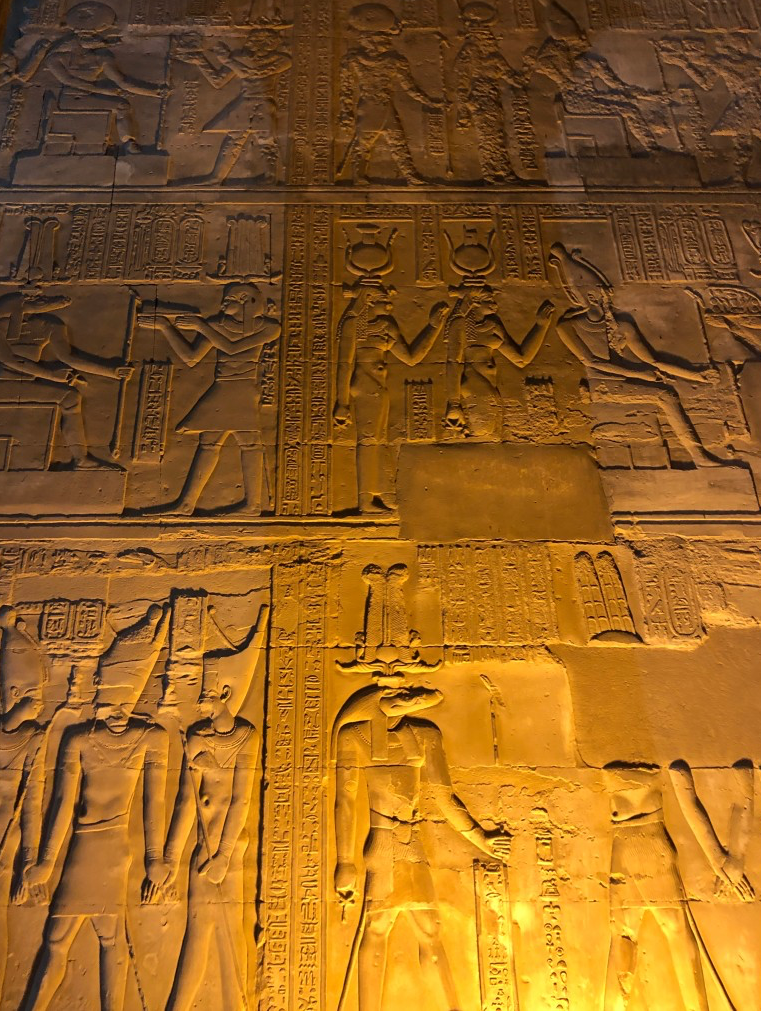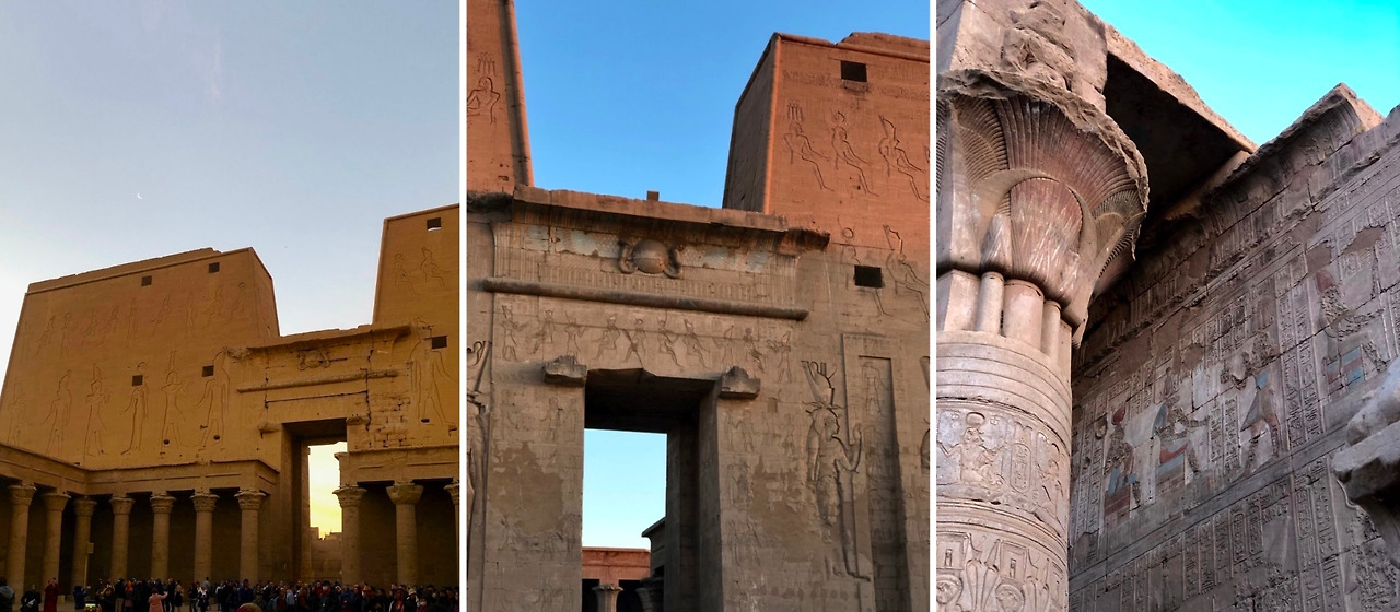 크루즈를 타고 도시에 정박하며 볼 수 있는 신전 두 곳. 악어 머리를 한 신, 세베크를 위한 콤 옴보 신전과 신들의 왕, 호루스를 위한 에드푸 신전이다.