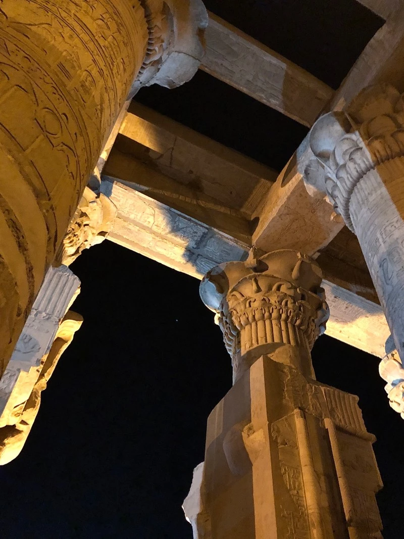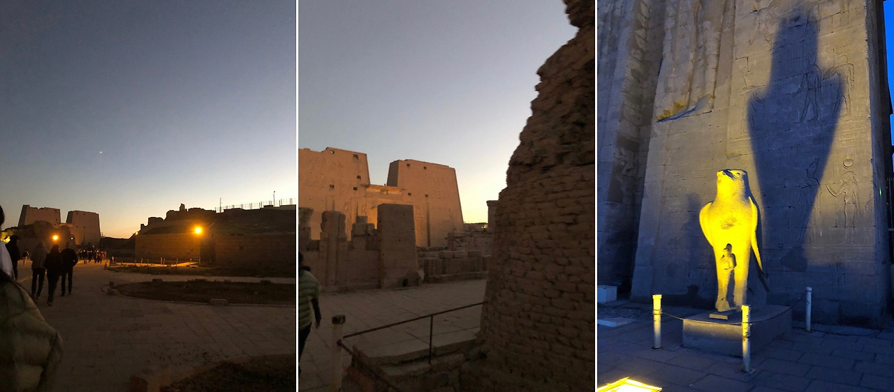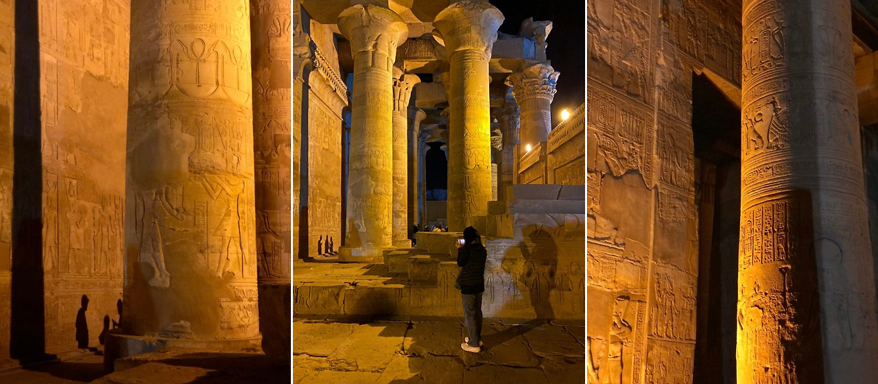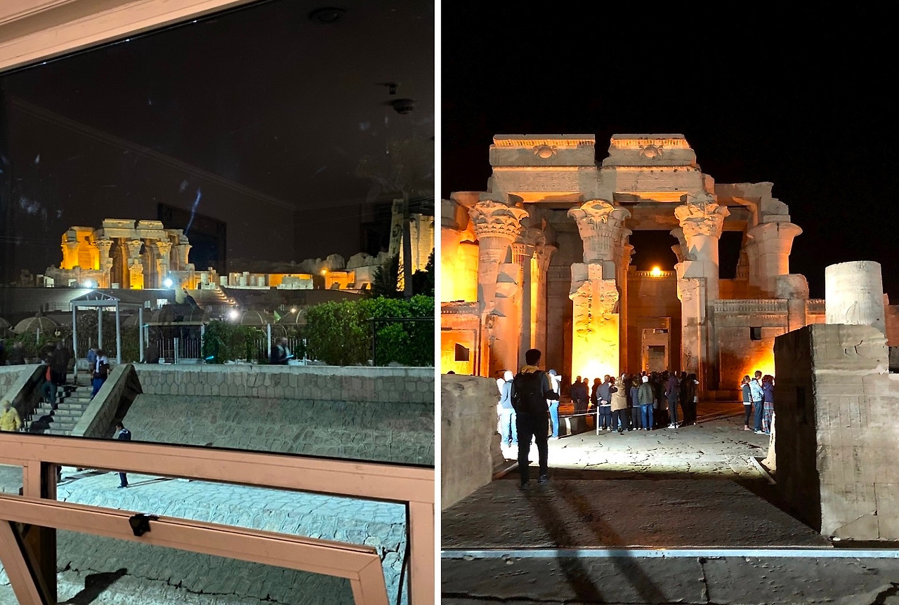아스완에서 크루즈 타고 콤 옴보에 도착했다. 강변에 위치하고 있어 크루즈에서도 잘 보인다. 방에서도 보이던! 크루즈에서 하선해 계단만 올라가면 된다. 밤에 보는 신전은 처음이라 조명에 따라 어른거리는 빛이 너무 멋졌다.