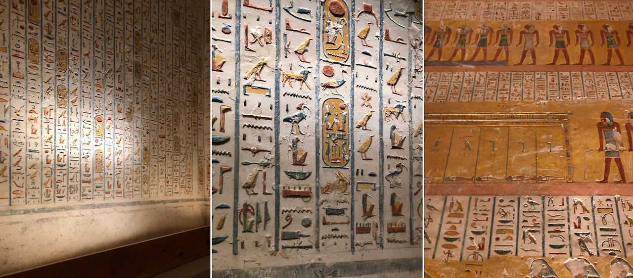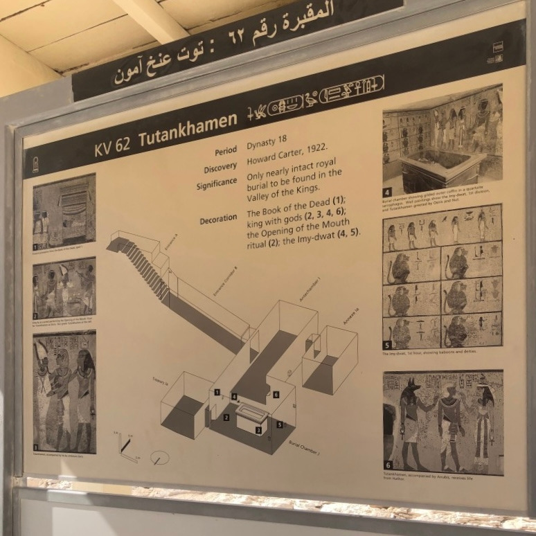 왕가의 계곡에는 우리는 투탕카멘의 무덤 주변에 위치한 무덤을 봤다. 입구 표지판에 무덤 내부에서 보면 좋을 포인트들을 표시해 놔서 좋았다. 비슷해보이는 히에로글리프 사이에서 그림들을 찾아보면서 벽화를 보는 것도 재미있다.
