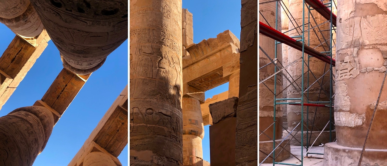 아몬 대신전의 열주랑. 파피루스 모양의 134개의 기둥이 서있다. 23m 높이로 마치 숲처럼 기둥들에 둘러싸인 느낌이 신비로웠다. 채색의 흔적도 볼 수 있고, 보수 작업하는 과정도 볼 수 있다.