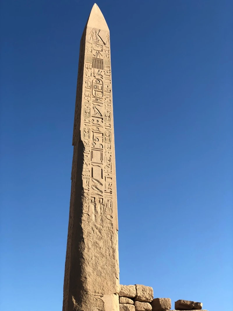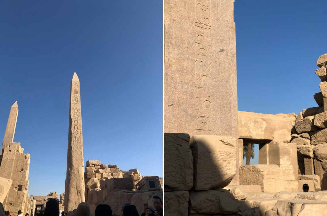 중앙에 서있는 카르낙 신전의 오벨리스크. 끝은 뾰족한 피라미드 모양으로 영원을 상징한다. 현재 카르낙 신전에는 2개의 오벨리스크가 서있다. 강력했던 여성 파라오, 하트셉수트와 그의 아버지 투트모세 1세가 세운 오벨리스크. (29.6m-325t / 23.2m-143t) 하트셉수트의 아들, 투트모세 3세도 오벨리스크를 세웠는데, 현재 이전되어 로마 라테라노 광장과 터키 이스탄불 히포드럼에 세워져 있다.