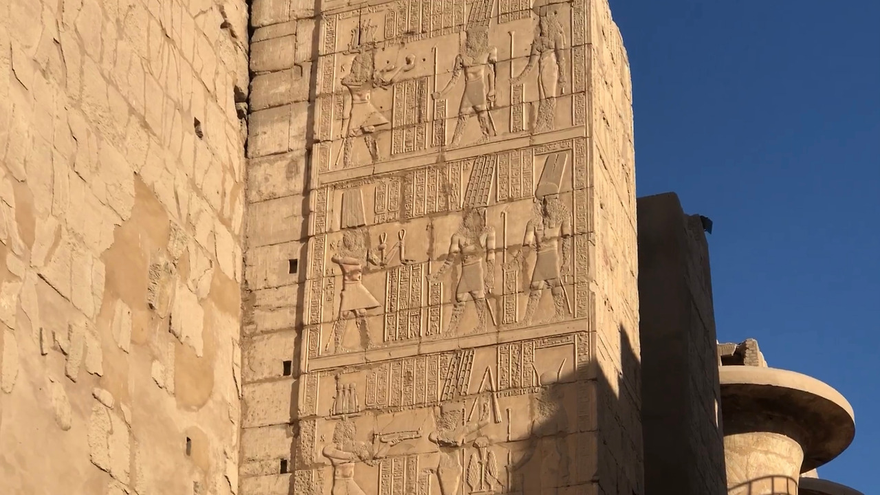 사다리꼴의 거대한 정문 ‘필론’ 너머로는 거의 무너진 아멘호테프 3세의 탑문을 볼 수 있다. 안쪽으로는 파피루스 줄기를 모방한 25m 기둥들이 이어지는 열주랑.