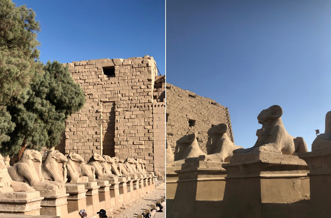 입구에 들어서면 신전을 지키는 파수꾼, 스핑크스가 양옆으로 이어진다. 카르낙 신전은 양 머리를 한 스핑크스라는 점이 특별하다. 양 머리 아래에는 작은 파라오가 서있다. 스핑크스가 파라오를 지켜준다는 의미를 담았다,