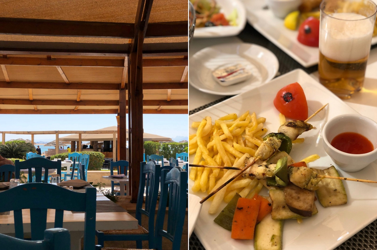 우선 밥부터 먹자! 룸 체크인 후 점심을 먹으러 갔다. 점심은 해안가에 위치한 씨푸드 레스토랑. 그릭 샐러드와 메인 요리가 서빙되었다. 맛있었지만 양이 적었다.. 여행 내내 배고픈 이집트..