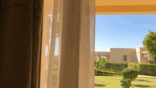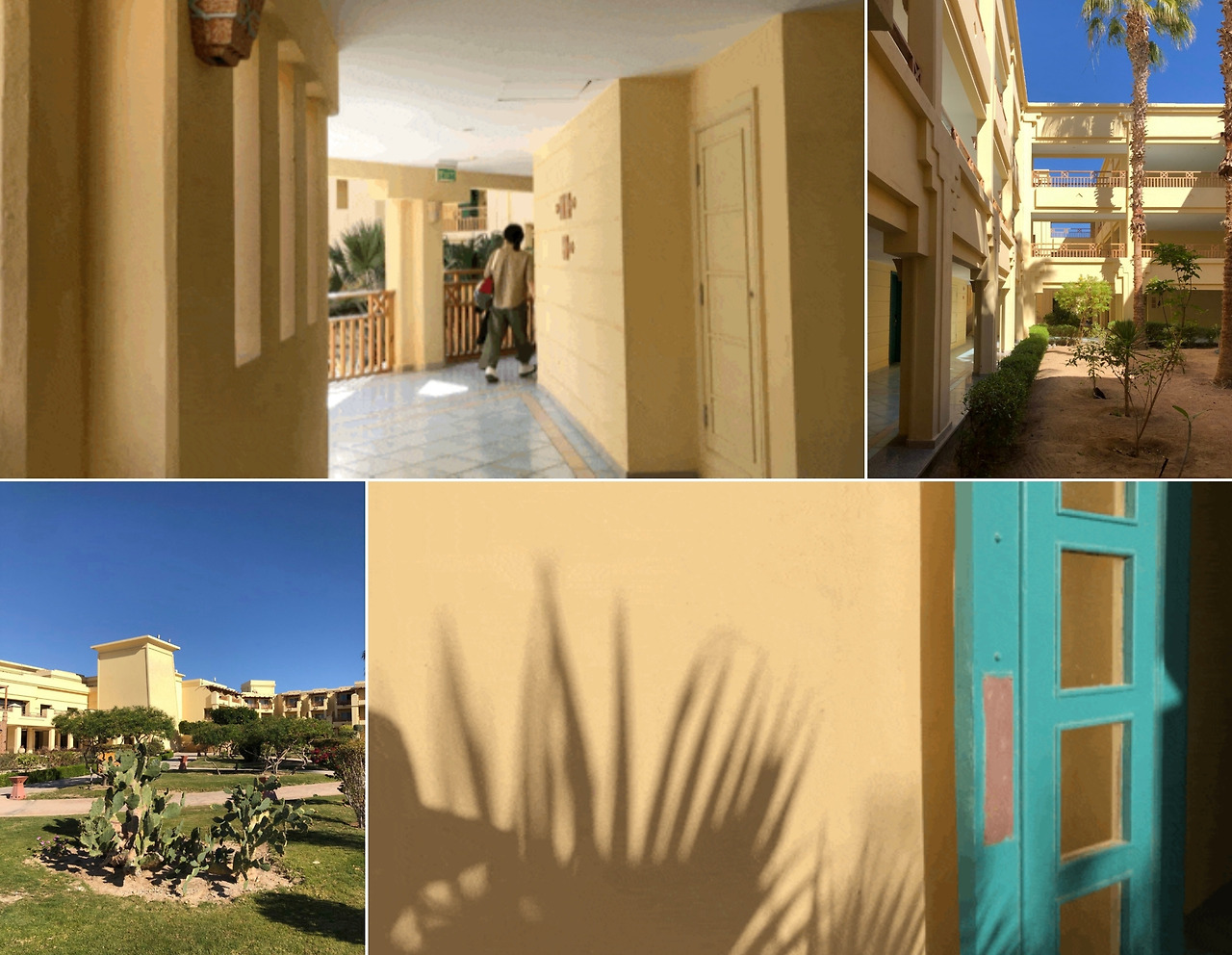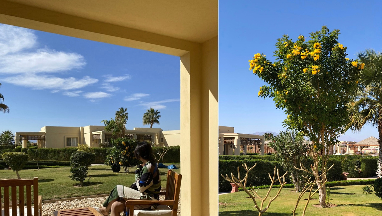룸 컨디션도 좋은 편! 발랄한 버터색과 올리브색, 라탄과 우드 소재의 가구들을 보니 정말 휴양지에 놀러 온 기분이었다. 여행이지만 바쁘게 다녔던 이집트 여행에서 정말 쉬면서 마무리한 기분. 우리 방 앞에 노란 꽃나무가 있어서 즐거웠던.