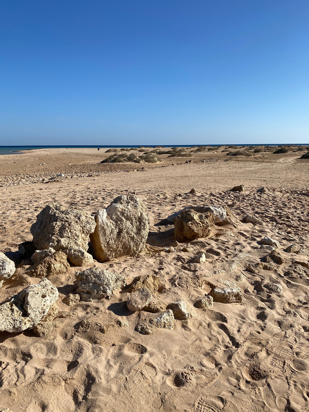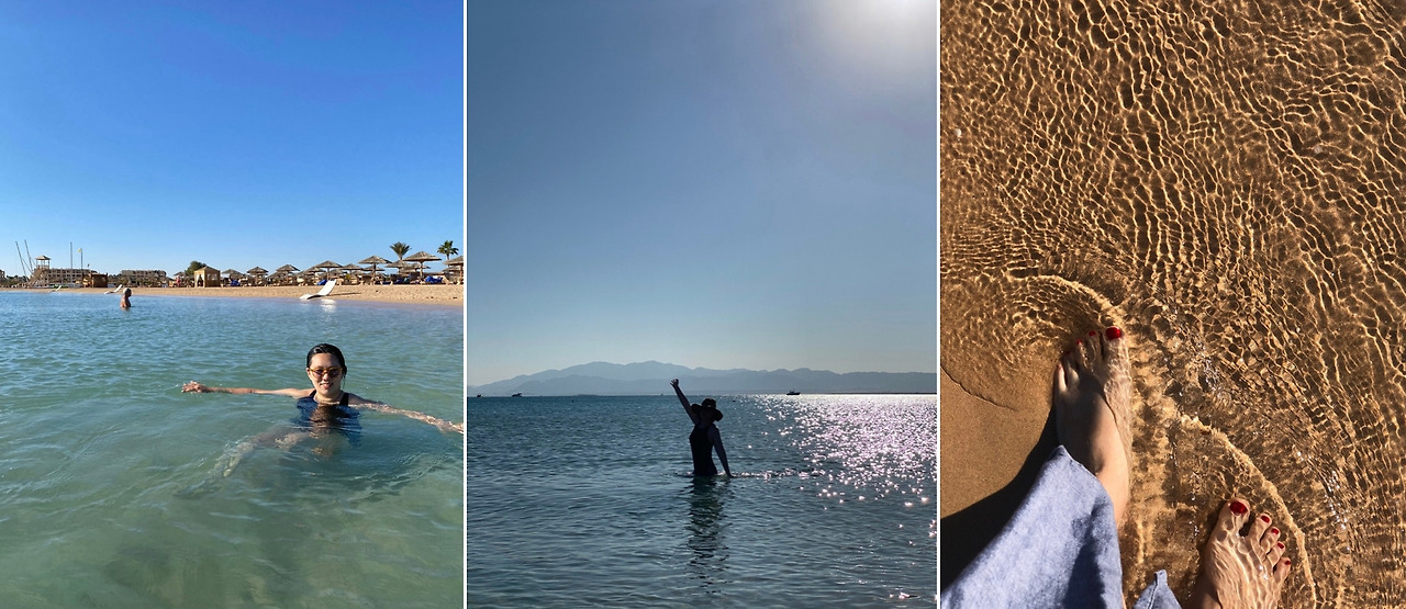 홍해는 지중해의 에메랄드빛이 아니라 하늘과의 경계가 잘 안 보일 만큼 짙푸른 색이다. 바다 건너편으로는 사막. 둥글게 이어지는 해안가를 걸으며 사파리 투어의 아쉬움을 달래 본다. 리조트 앞 수심은 엄청 얕은 편! 허리 정도까지 오는데 모래도 부드럽고 수영하며 놀기 좋았다.