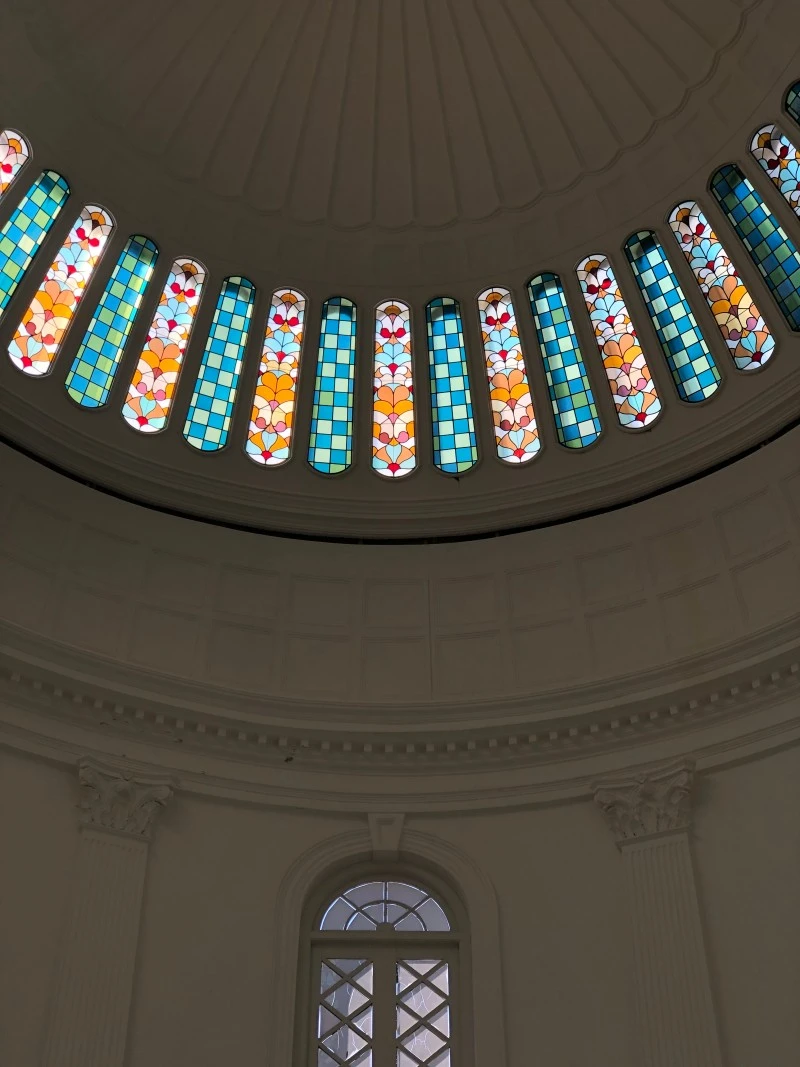 아치형 입구로 들어서면 로툰다 돔 바로 아래. 고개를 들면 국립박물관의 하이라이트인 스테인드글라스를 볼 수 있다. 3천 여개 타일을 사용해 돔을 따라 한 바퀴 원형처럼 그려져 있다. 1887년 개관 당시 영국 여왕의 50주년을 기념해 50개의 창으로 구성했다고. 블루와 그린 체크 패턴과 꽃처럼 그려진 피쉬 패턴이 번갈아가며 배치했는데 컬러 대비부터 빈티지한 패턴까지 너무 아름다웠다.
