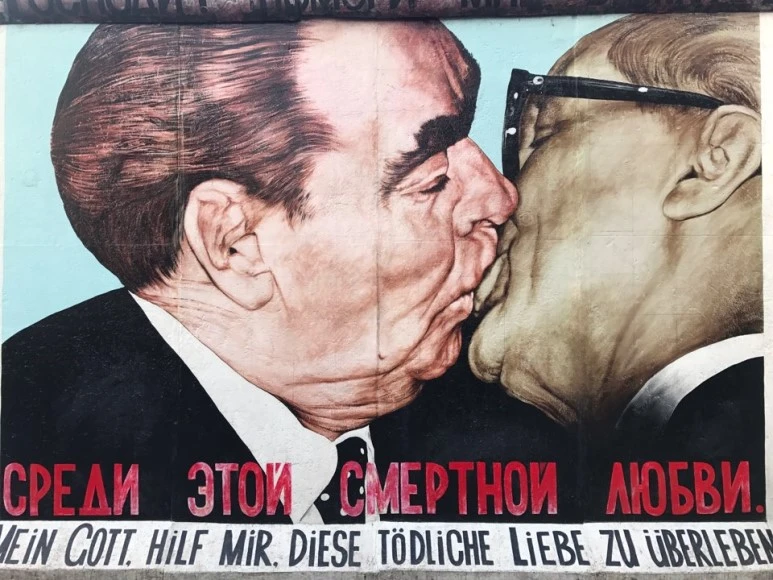 '형제의 키스.' 너무 유명한 그림입니다. 키스를 나누는 한 사람은 국가평의회 의장을 지낸 당시 동독의 최고 권력자 호네커이고 다른 한 사람은 소련의 공산당 서기장이었던 브레즈네프입니다.
