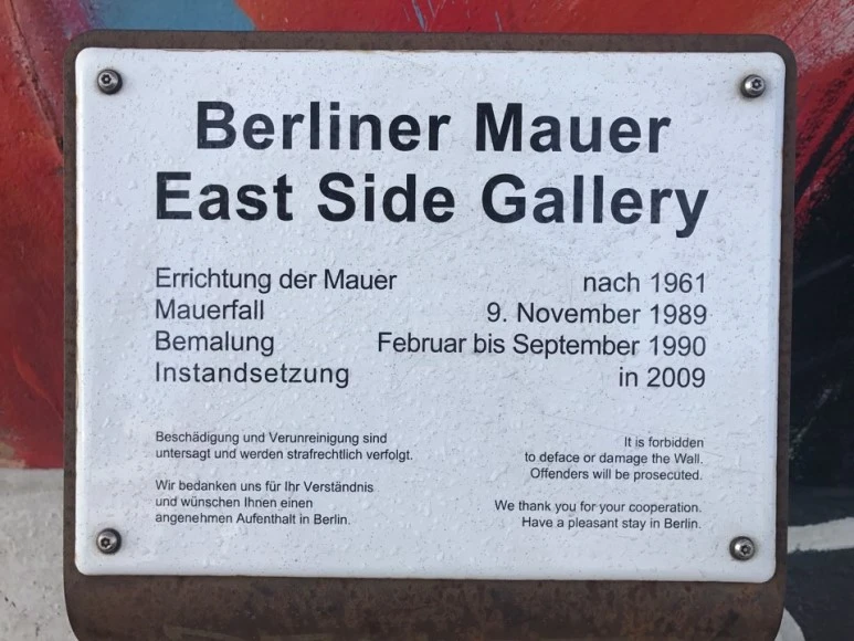 Berlin East Side Gallery를 알려주는 표지판입니다. 흉물스러운 장벽을 전 세계 예술가들이 벽화로 만들었고 이 곳은 지금도 평화롭게 역사의 한 장면을 드러내고 있습니다.