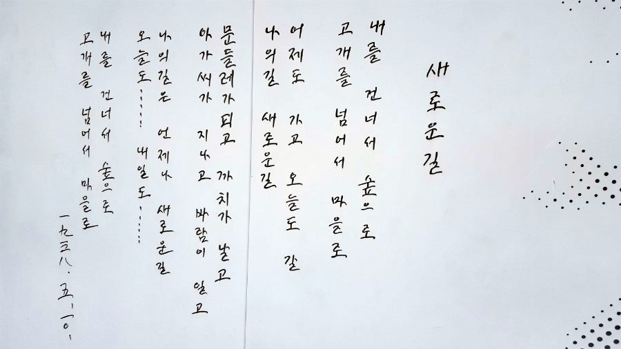 ‘죽는 날까지 하늘을 우러러 한 점 부끄럼이 없기를 잎새에 이는 바람에도 괴로워했던’ 윤동주 시인의 장례식 때 시 두 편이 낭독되었는데 하나는 ‘우물 속의 자화상’이고 다른 하나는 ‘새로운 길’이었다고 한다. 독립을 기원하는 마음을 담았다고 알려져 있는 시 ‘새로운 길’이 종로구 청운동에 있는 윤동주 문학관 입구에 쓰여 있다. 관리자분께 여쭈였더니 윤동주 시인의 필체라고 알려주신다.
