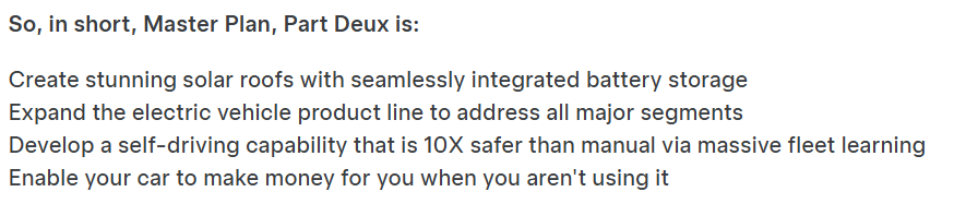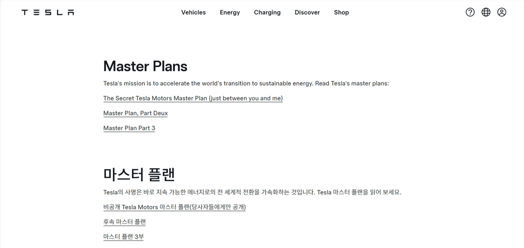 이번에 공개한 마스터 플랜이 Part IV 라는 것은 당연하게도 그 이전의 계획들이 존재하고, 테슬라 웹사이트에 과거의 마스터 플랜 Part I, II, III 가 모두 공개되어 있습니다. (Master Plans | Tesla)
