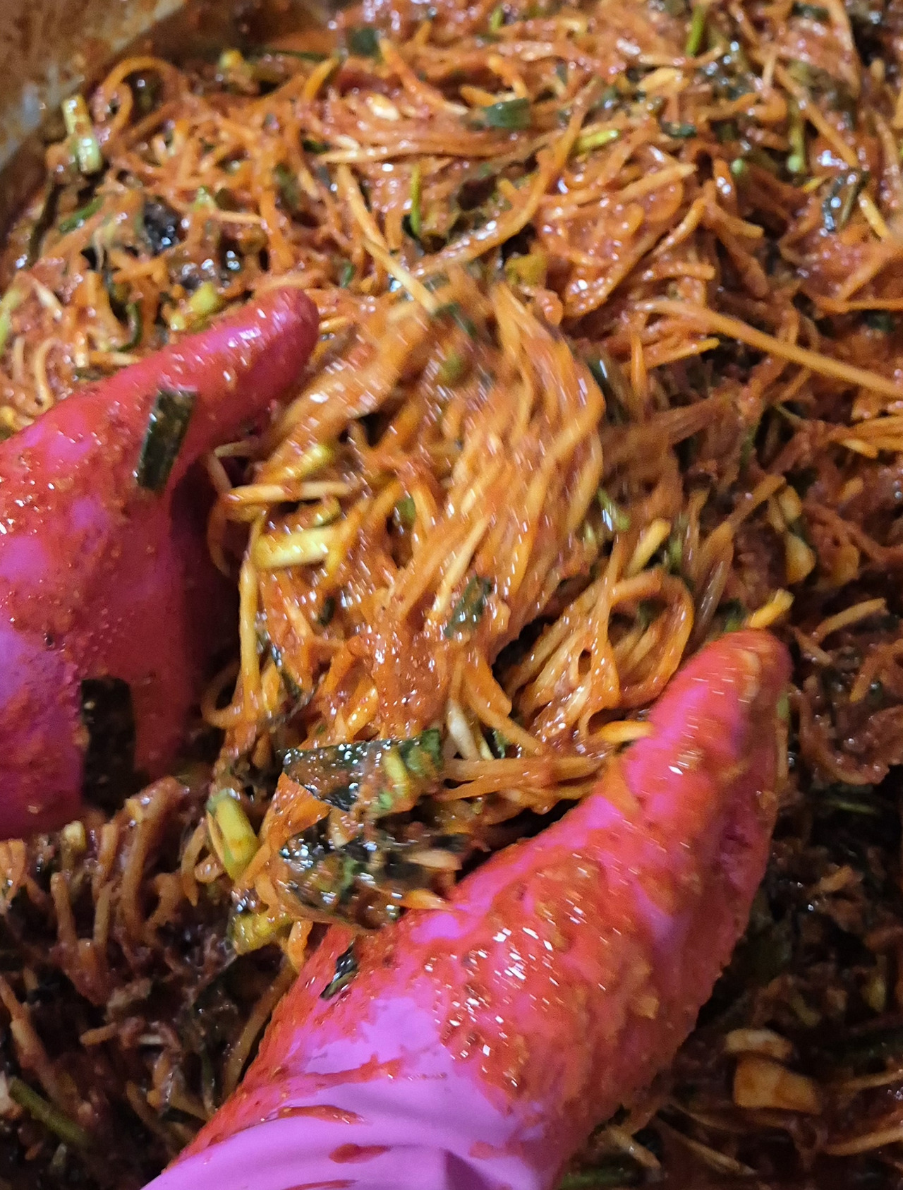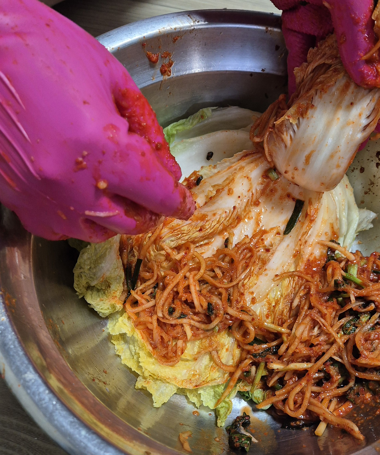 김치 속을 다 만들고 배추에 양념을 넣기만 하면 되는 시간이다. 손을 다쳤음에도 불구하고 동생은 열심히 배추를 버무렸다. 그건 인정. 양념이 어찌나 잘 되었는지 배춧잎에 싸서 먹기만 해도 꿀떡꿀떡 넘어갔다. 특히 강화도산 매운 고춧가루가 감칠맛을 더했다.