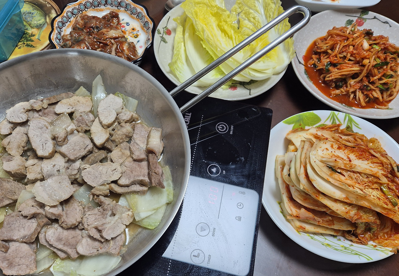 드디어 수육과 함께! 저녁시간이 되어 우리 남편도 합류를 했다. 역시 먹을 복이 넘치는 사람이다. 장모님이 특별히 더 잘 차려주기도 하지만 말이다. 대식가인 남편은 배추에 고기를 두세 개씩 넣어서 야무지게 잘 먹었다.