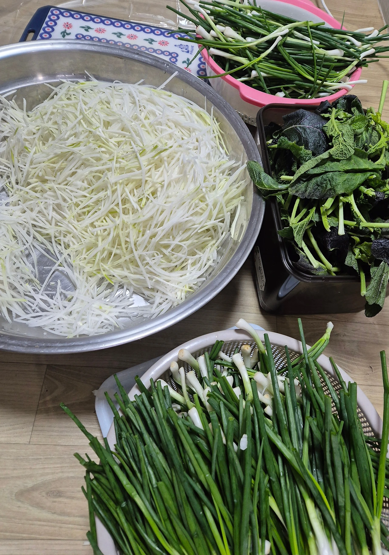 꾸역꾸역 친정에 들어서자 엄마는 이미 많은 일을 손수 해놓으셨다. 갖은 재료 준비는 물론, 깨끗이 씻어서 절여진 배추까지. 나는 파, 갓, 무 등을 다듬어 양념에 넣기 좋게 썰기만 하면 되었다.
