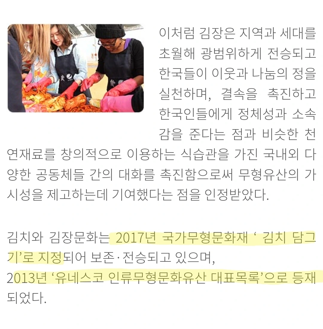 무려 12년 전인 2013년에, 김장이 유네스코 인류무형문화유산에 등재된 것이었다. 나는 이 사실도 모르고 지냈다. 그리고 2017년에는 국가무형문화재에 지정되었다는 사실도 전혀 몰랐으니... 그저 부끄러울 뿐이다.