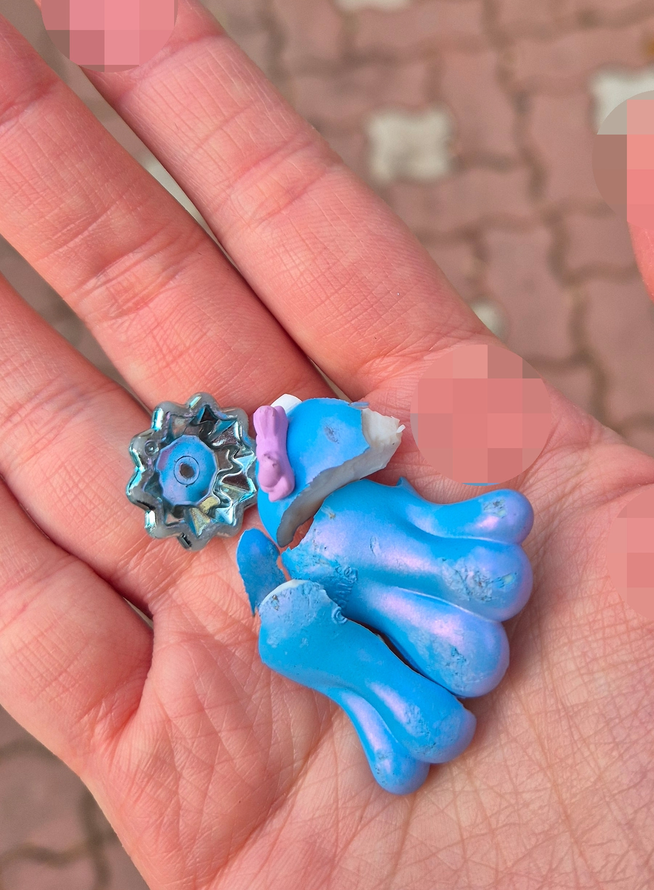 차가 정차한 지점을 살펴봤다. 그런데 이게 왠 걸! 사뿐핑은 바닥에 산산조각이 나 있었다. 아마도 아이 손에서 떨어진 후 차들이 짓밟고 갔나 보다.