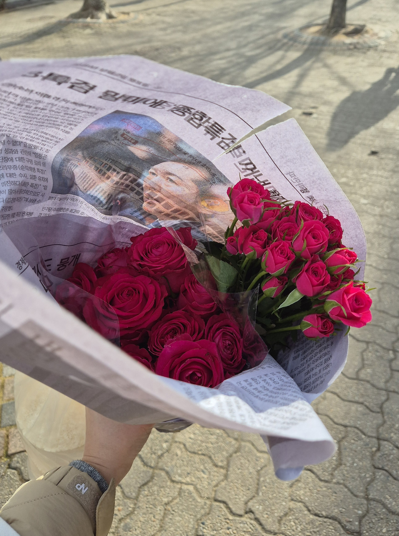 무슨 꽃이 날 기다리고 있을지 두근거리는 마음에 발걸음이 가벼웠다. 그런데 가는 길에 사방을 둘러보니, 이미 많은 분들이 신문지 뭉치를 들고 내 방향으로 걸어오고 계셨다. 그렇다. 그 꽃 판매자분께서는 꽃을 신문지에 둘둘 말아서 주시기 때문이었다. 마치 꽃 도매상가에서처럼 말이다.