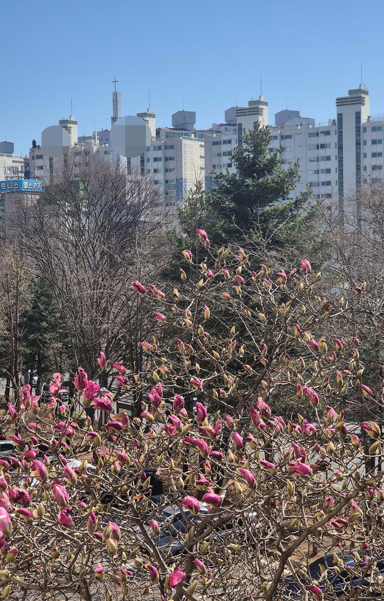 아직 바람은 차지만 햇살 아래는 무척 따스하다. 그렇게 봄기운이 퍼지고 있는지 집 앞 자목련은 반나절 만에 그새 얼굴을 더 내밀었다.