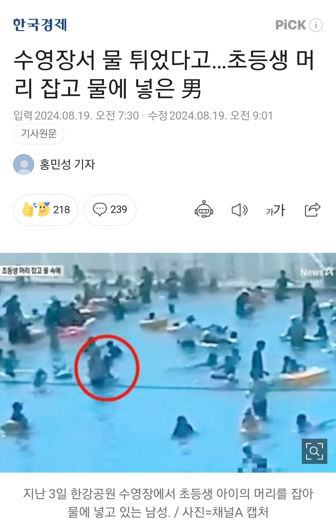 자세히 보면 해당 남성은 한 팔에 자신의 아이를 안고 있다. (본인 아이가 아닐 수도 있다.) 그리고 다른 손으로 남의 집 아이를 해한 것이다. 아버지라는, 혹은 자신의 일가친척 또는 절친한 친구 가정에도 아이가 있는 사람이 꼭 그래야만 했을까? 보도된 바에 따르면 물이 튀어서 그에 대한 복수를 한 것이라고 하는데... 수영장에서 물이 튀는 게 당연한 일이 아닌가 싶다. 또 추측컨대, 본인이 안고 있는 아이에게 물이 심하게 튀어서 과민 반응을 했으리라 생각된다. 나의 추정일 뿐이다. 아무리 그래도 그렇지. 7살 아이에게 너무 심하게 대응한 것 아닌가? 학대를 당한 아이는 평생 트라우마를 안고 살아갈 텐데.