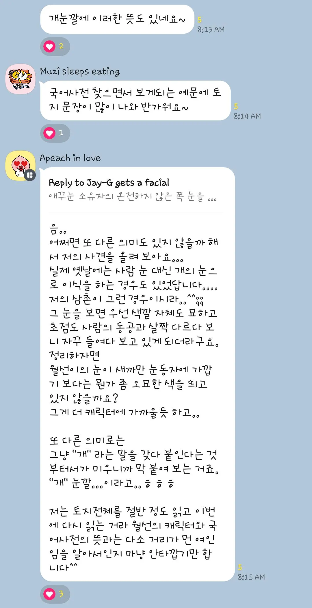 오늘 아침 문득 책을 읽다가 궁금한 점이 생겼다. 과연 "개 눈깔"이라는 것이 어떤 눈을 말하는 것인가? 지난번 <부활>에서는 여주인공 카츄사가 '사시'라는 언급이 아주 많았었다. 예쁘고 매력적인 영혼의 소유자인 그녀에게 '눈이 사시'라는 점이 어떤 함의를 가지고 있는지 그에 대한 답을 찾지 못해 답답함이 남아 있던 상태였다. 그런데 <토지>에서는 잘생긴 남자 용이와 이루어질 수 없는 사랑을 이어오는 여자 월선이가 개의 눈을 지녔다니... 그 뜻이 너무 궁금하고 정확히 알고 싶은 집념이 생겼다. 검색을 해봐도 도무지 해답을 찾을 수 없어서 독서 모임 단톡방에 그 의미를 여쭤보았다.