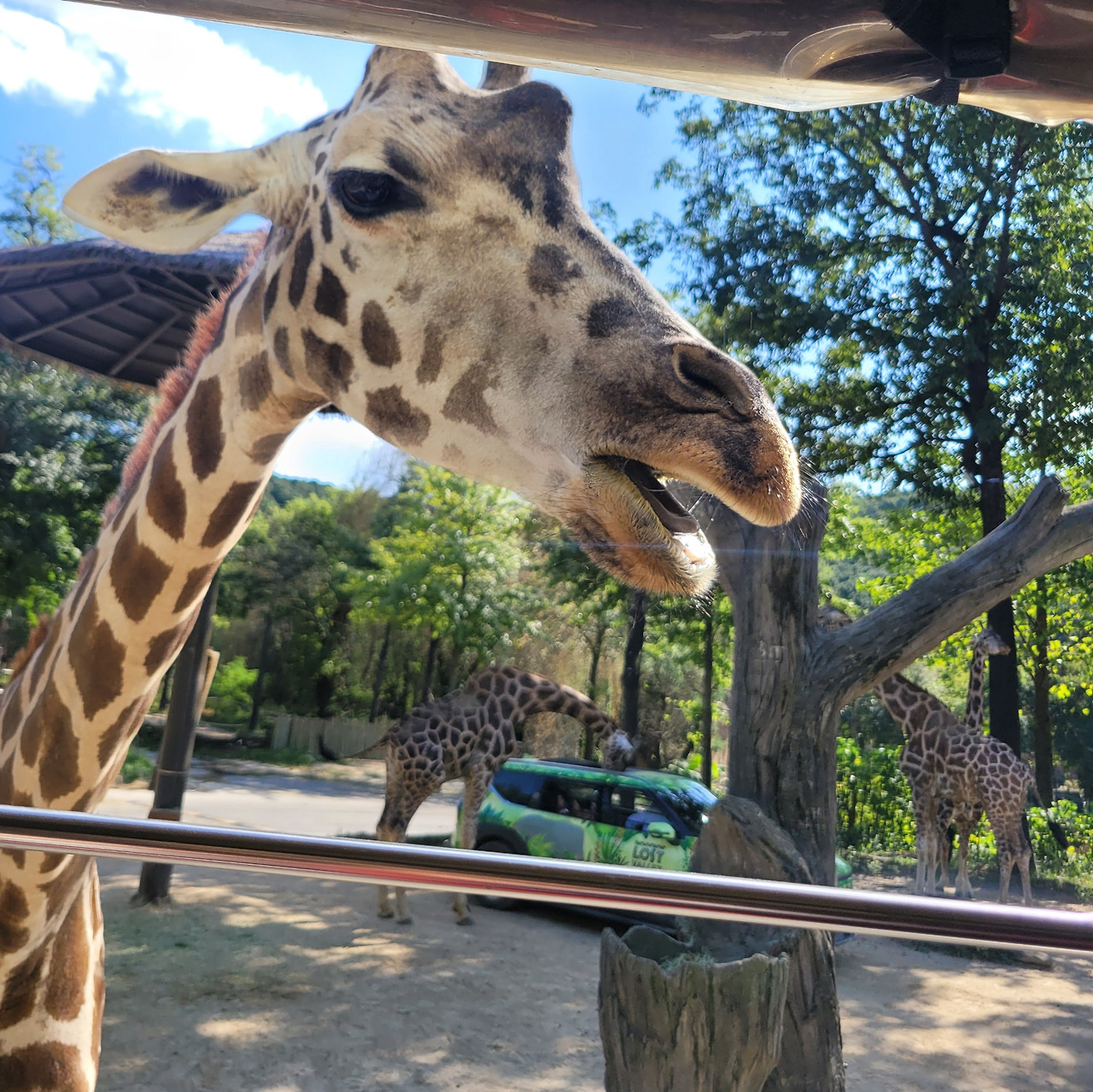 기다리고 기다리다 진짜 우리 차례가 오기 직전! 호두는 유모차에서 잠이 들고 말았다. 로스트밸리에서 코끼리랑 기린을 보여주려고 했는데 말이다, 가장 결정적인 순간에 아이가 잠들어버린 것이다. 진작 점심 먹고 유모차에서 눈 좀 붙였으면 좋았을 것을. (타이밍이 야속하다.) 결국 자는 아이를 안고 버스에 탑승해서 구경을 했다. 기다린 시간이 아까워서 그냥 우리라도, 아니, 나라도 봐야겠다 싶어서 그냥 들어갔다. 기린을 가까이 봐서 너무 좋았다. 호두랑 같이 봤으면 더 좋았을 것을.