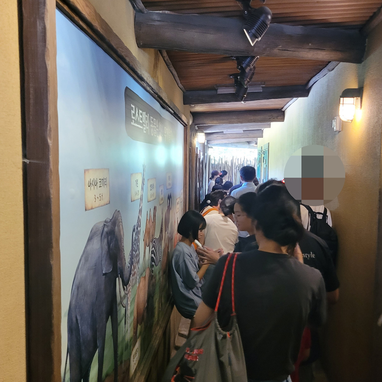 사파리를 보고 나왔는데 딱히 구경할 거리가 없었다. 2시에 로스트밸리에서 초식 동물들을 볼 예정이었는데 점심을 먹어도 시간이 한참이나 남았다. 그래서 웨이팅 없이 관람이 가능한 뿌빠 타운에서 알파카, 원숭이, 각종 설치류 등과 이글쇼를 보고 나왔다. 아쉽게도 인기가 많은 판다월드는 못 볼 것 같아서 주변에 있는 동물들만 둘러보고 로스트밸리에 대기를 하러 갔다. 그런데 대기줄이 어마무시했다. 뱀이 똬리를 튼 것처럼 구불구불 끝 없이 안으로 들어갔다. 비교적 로테이션이 빠른지 쭉쭉 들어간 편이긴 했지만, 이제 관람인가 싶으면 다시 줄이 시작되고를 반복했다. 새벽부터 애를 안고, 목마 태워주고, 운전까지 한 남편은 벌써 체력이 방전됐다. 호두도 낮잠 시간이 겹쳐오니 비몽사몽이었다.