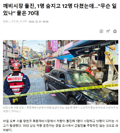 지난해 마지막 날, 재래시장에서 한 승용차가 시장으로 돌진해서 한 명이 숨지고 십여 명이 다치는 사고가 발생했다. 새해를 앞두고 (혼란한 시국으로 이전해 보다는 덜 했겠지만) 약간이나마 들뜬 마음으로 시장에 나갔을 사람들. 하지만 누군가는 새해를 맞이하지 못한 채 세상과 이별을 하게 됐다. 마침 친구 중에 이 시장과 가까운 거리에 살고 있는 친구가 있었고, 단체 카톡방에서는 혹시 모를 소식에 그 친구에게 황급히 안부를 물었다. 다행히 그 친구는 사고와 관련이 없었고 우리들은 가슴을 쓸어내려야 했다. 자칫하면 내 친구, 내 일가친척이 맞닥뜨릴 수 있는 일이었다는 생각에 이 사고가 기억에서 지워지지 않는다.