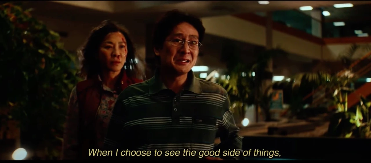 그때 에블린을 붙잡은 것은 남편 웨이몬드이다. 다른 세계에서 세계를 구하는 요원으로 활동하고 있던 웨이몬드는 딸 조이를 멈추기 위해 우리 좀 더 다정해지자고 외친다. The only thing that I do know is that we have to be kind. 어떻게 해야할지 모를 때일수록, 우리는 서로에게 다정해야 해 에블린. 파괴적인 싸움을 일삼던 에블린의 머릿속에는 세탁소를 운영하며 쌓아온 남편과 아이와의 다정한 일상이 떠오른다. 그녀는 그 후 파괴를 위한 싸움이 아닌 사랑을 위한 싸움을 해나간다. 모든 것이 가능한 멀티버스 세계에서 무기는 키스로, 수류탄은 향수로, 총은 아이의 목소리로 바뀐다. 다정한 말 한마디에 사람들은 무너지고, 조부 투바키는 귀여운 딸 조이로 돌아온다.