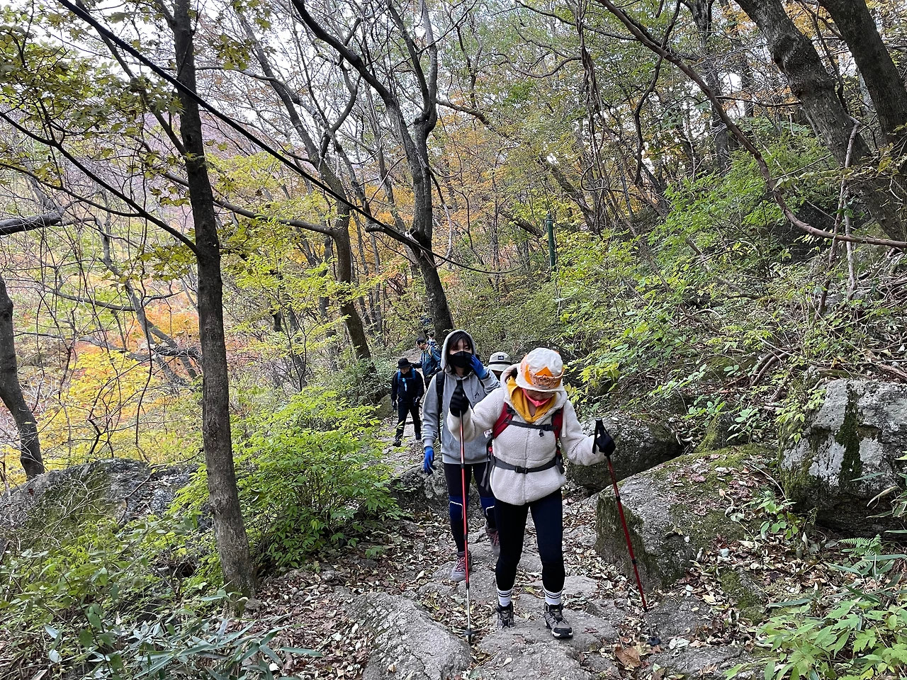 모든 산이 그렇듯, 지리산도 초입은 가벼운 운동 정도라 생각하고 걸을 수 있는 수준이다. 중산리에서 법계사까지의 길은 꽤나 완만하다. 높다랗게 자란 나무들 사이에서 가을 풍경을 즐기고, 아침의 새 소리를 만끽할 수 있다. 왼쪽으로 흐르는 계곡 물이 얼마나 차가울지 상상해본다. 새벽이라 약간 배가 출출한 느낌이 들지만, 어차피 등산은 다이어트에도 좋으니 아직 간식을 먹는 건 이르다.
