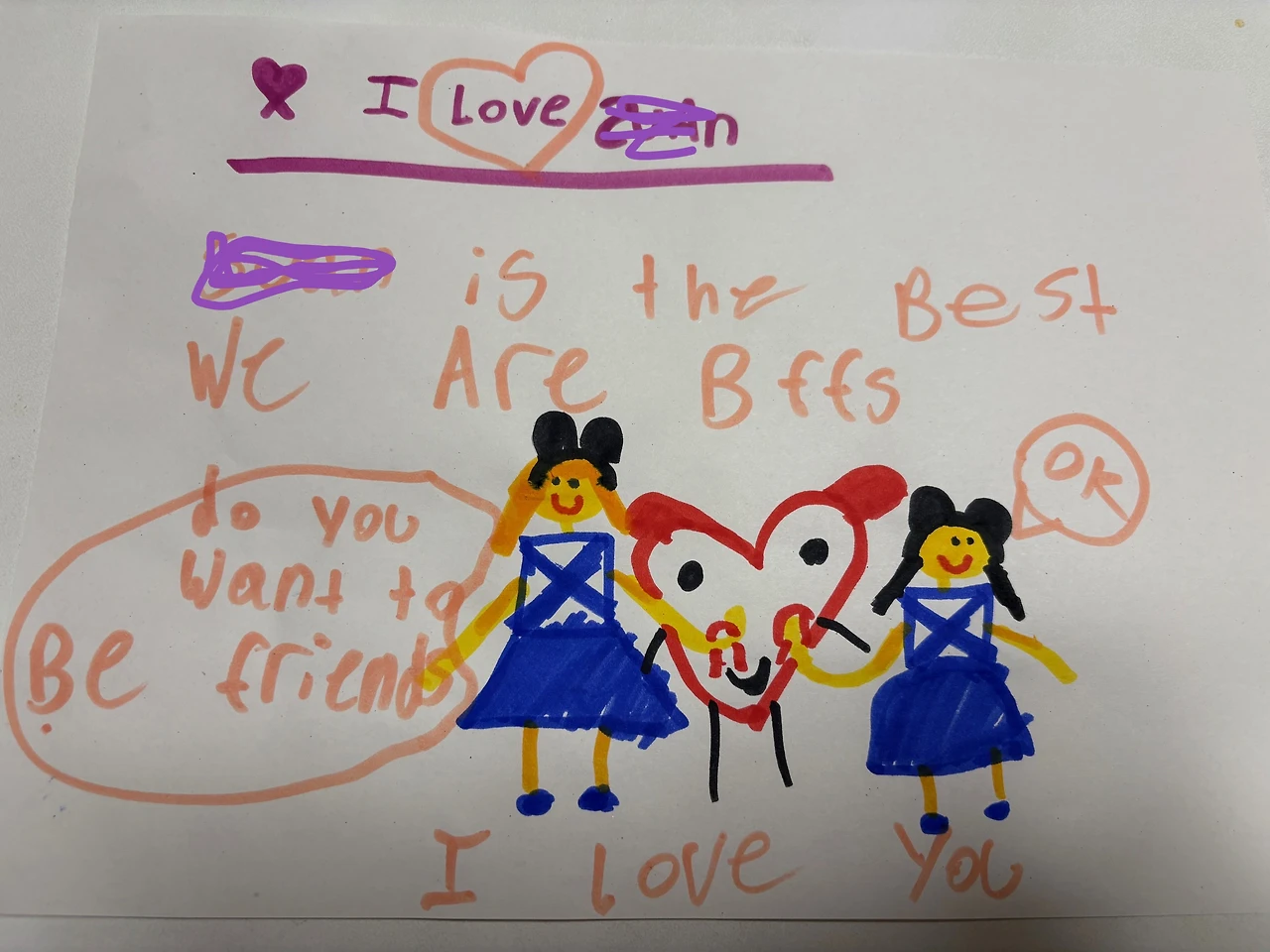 어떤 날은 친구들이 놀이에 껴주지 않아 혼자 놀았다고 덤덤히 털어놓길래, 그런 날이 누구에게나 있을 수 있고, 그 친구들 입장에선 네가 언어를 제대로 구사 못하니 답답해서 그랬을 수 있지 않겠냐고 지극히 T 스러운 위로를 해주기도 했는데...다음 날 물어보니 또 엄청 친구들과 잘 놀았다고 한다. 그리고 얼마 지나지 않아 그녀와 베스트프렌드가 되어 기쁘다며 친구가 그려준 그림까지 보여준다.