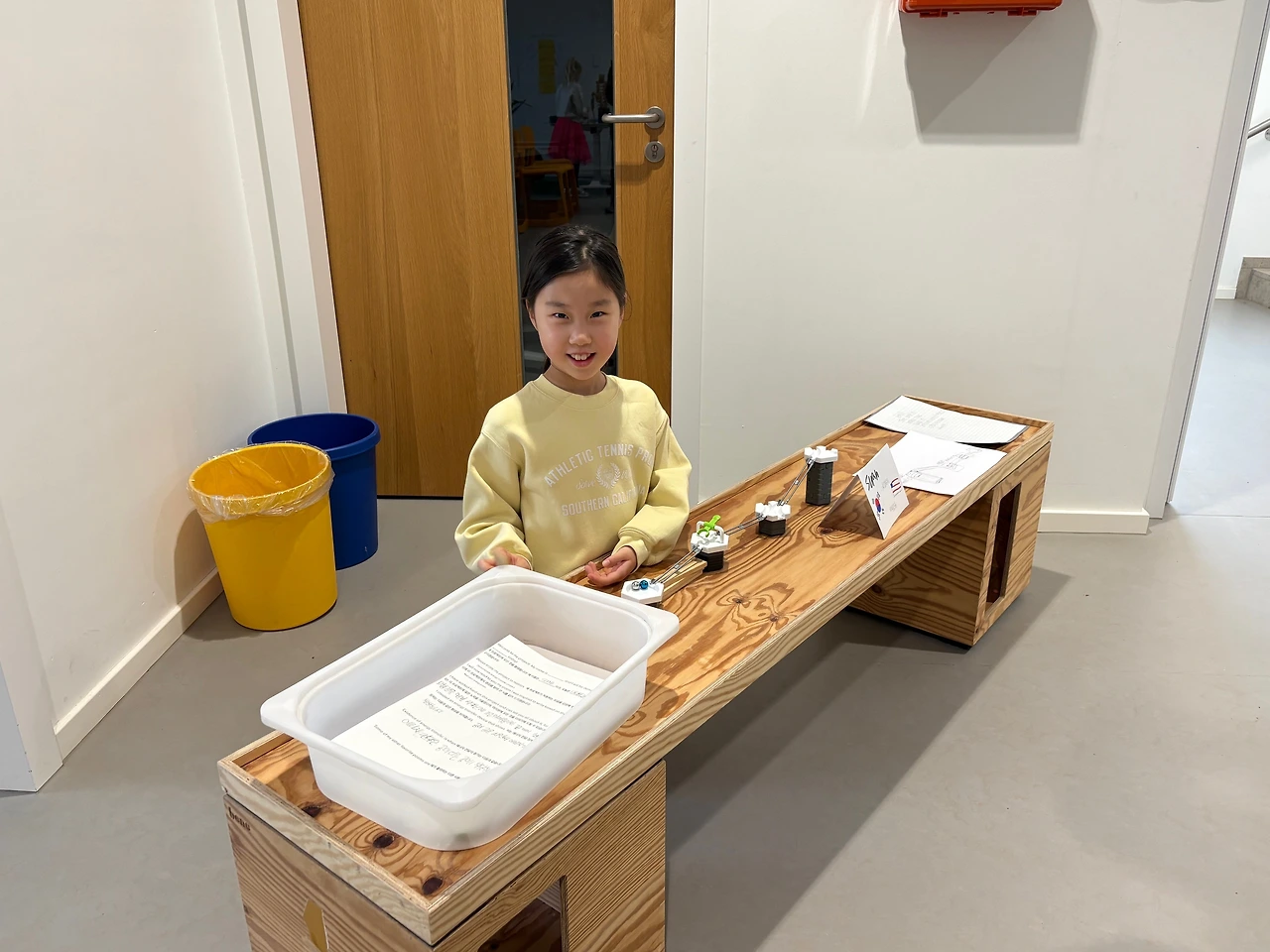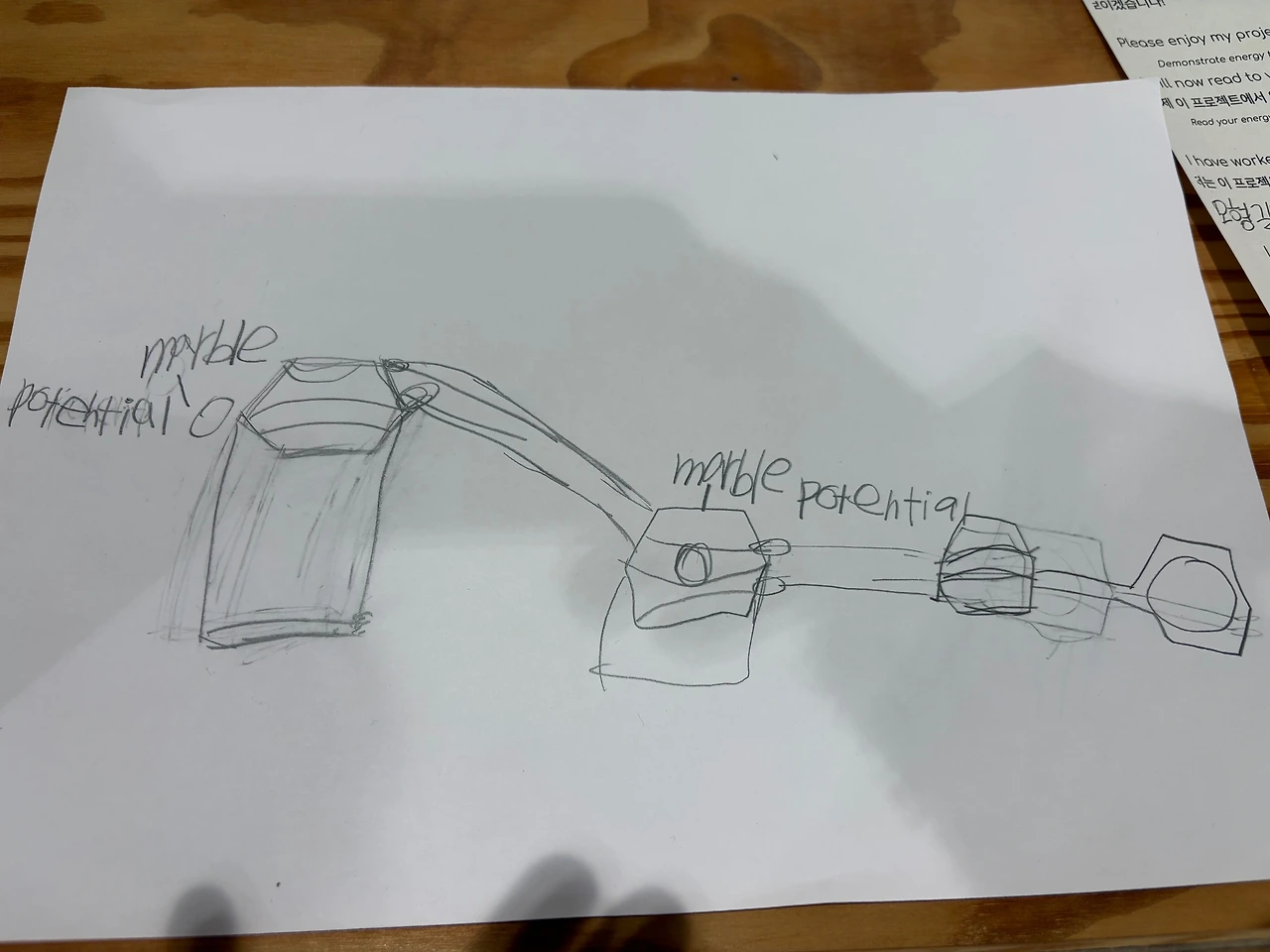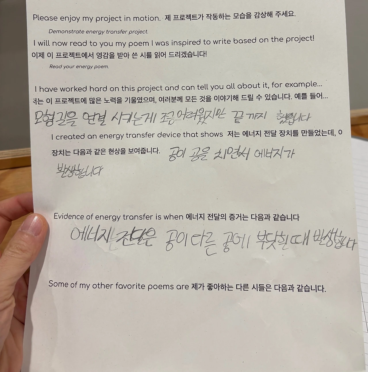 전시의 주제는 ‘에너지(위치 에너지, 운동 에너지)의 흐름’을 보여주는 작품과 그에 어울리는 시를 창작하는 것. 아이들은 각자의 부스를 방문한 학부모들에게 자신의 작품을 설명했다. 아직 영어가 서투른 아이에게 영어로 작품을 설명하는 건 무리였기 때문에, 작품 설명을 기록한 종이가 있었고, 그 종이는 반은 한글, 반은 영어로 채워져 있었다. 패드의 통역기를 동원해 나름대로 한글로 초고 작업을 하고, 그것을 기반으로 영문 작업을 한 것이었다.