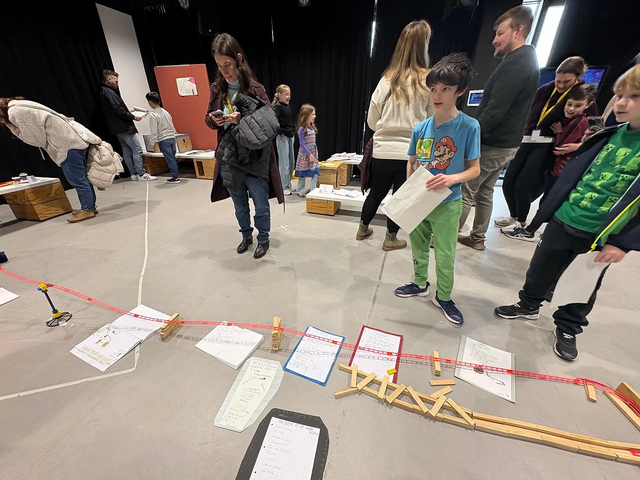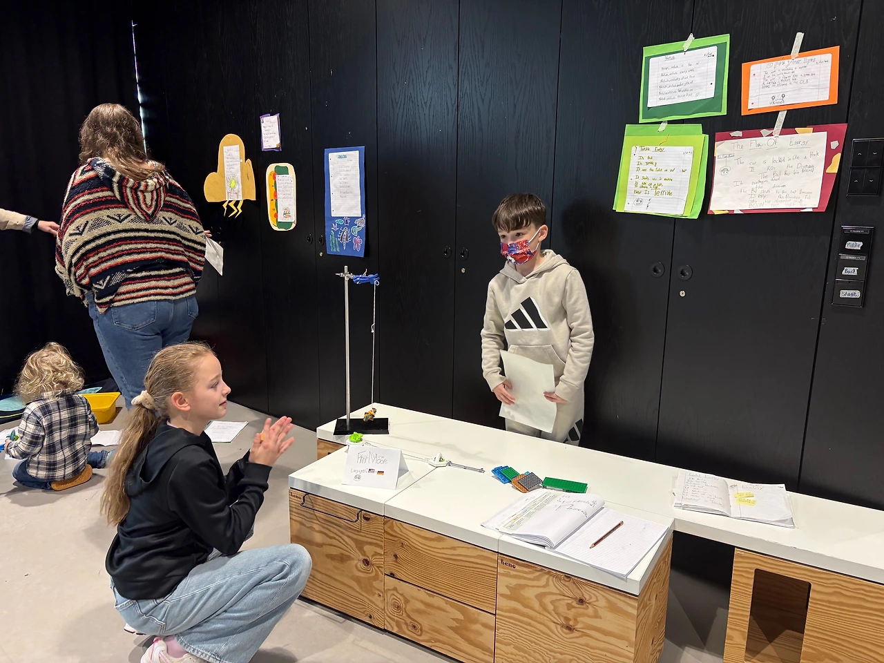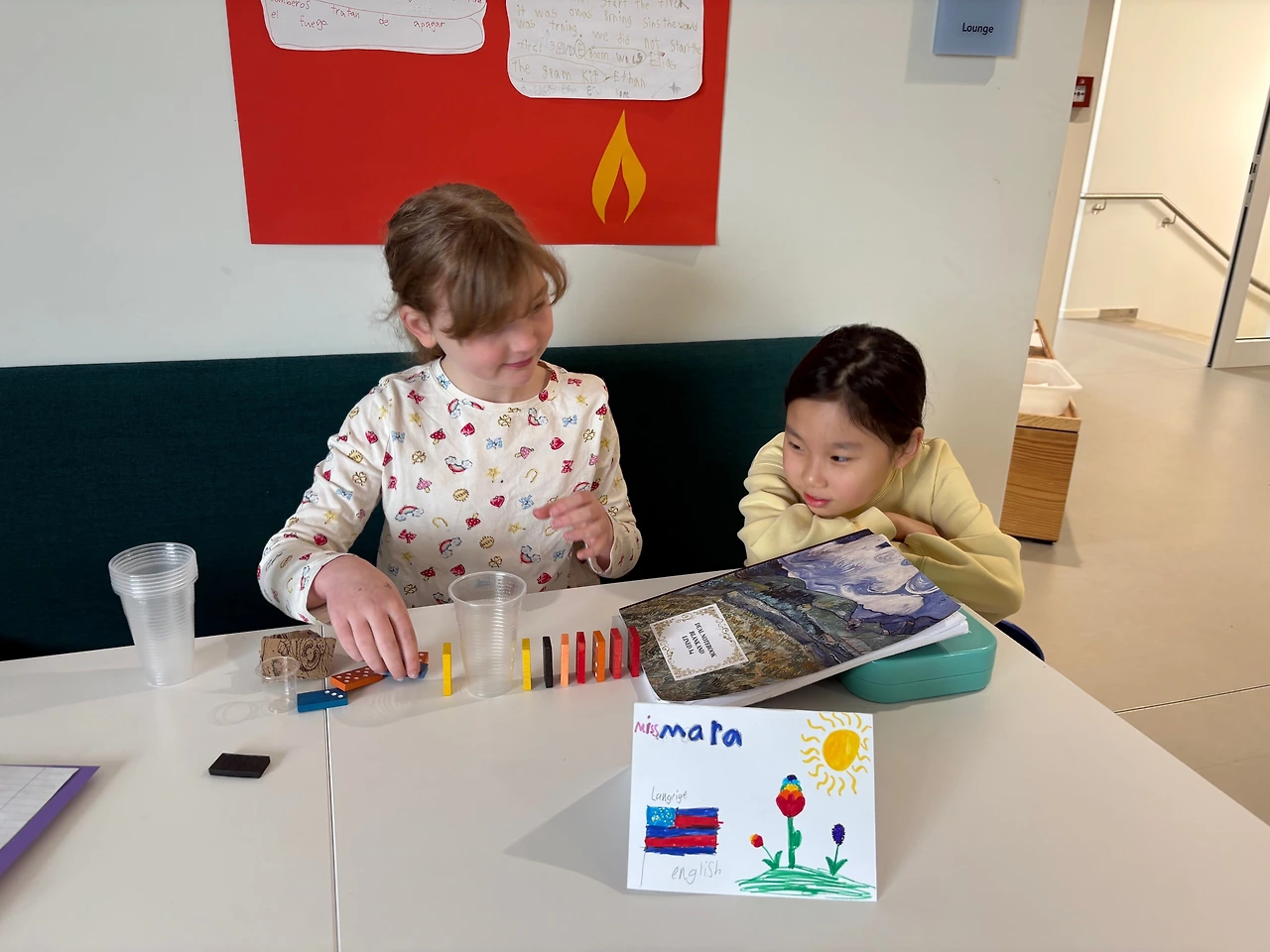 전시의 주제는 ‘에너지(위치 에너지, 운동 에너지)의 흐름’을 보여주는 작품과 그에 어울리는 시를 창작하는 것. 아이들은 각자의 부스를 방문한 학부모들에게 자신의 작품을 설명했다. 아직 영어가 서투른 아이에게 영어로 작품을 설명하는 건 무리였기 때문에, 작품 설명을 기록한 종이가 있었고, 그 종이는 반은 한글, 반은 영어로 채워져 있었다. 패드의 통역기를 동원해 나름대로 한글로 초고 작업을 하고, 그것을 기반으로 영문 작업을 한 것이었다.