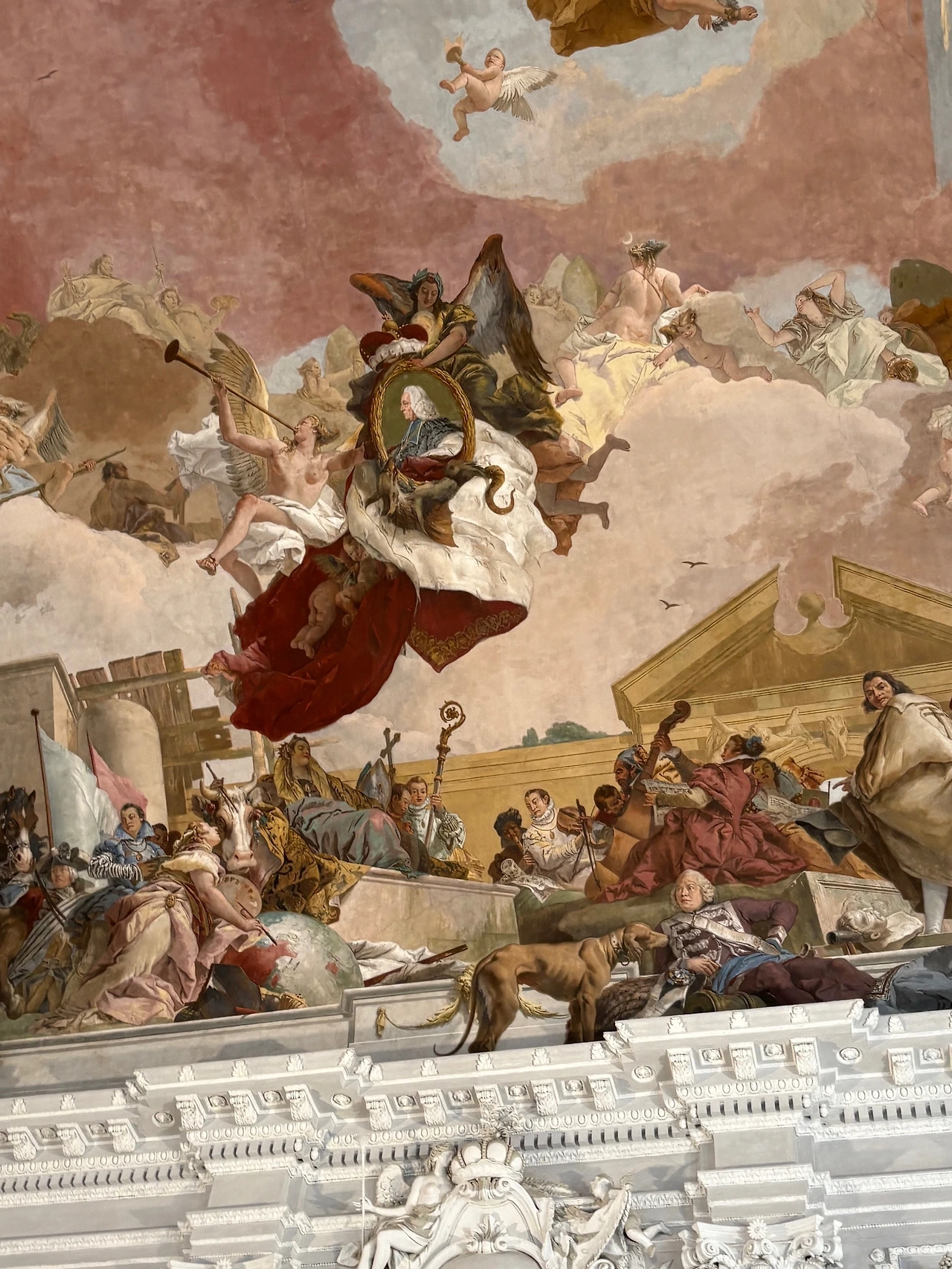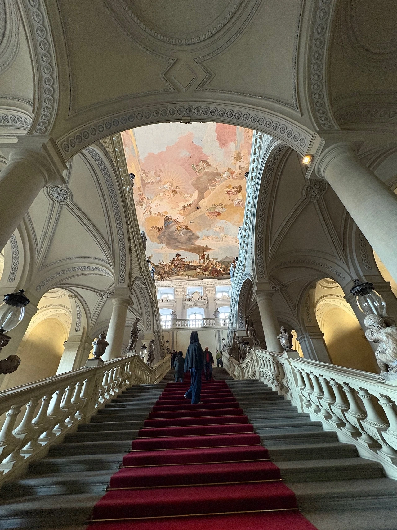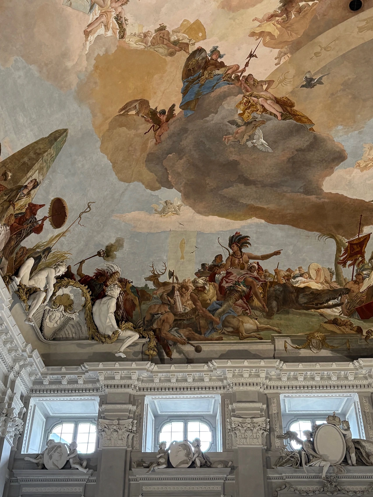 첫째, 이 궁전을 짓기 위해 투입된 당대 유럽 최고 예술가들의 압도적인 노동이다. 독일의 천재 건축가 발타자르 노이만이 전체 설계를 맡았고, 이탈리아 화가 조반니 바티스타 티에폴로는 세계에서 가장 큰 단일 프레스코화를 그려냈다. 궁전 입구의 계단을 오르며 맞닥뜨리는 이 프레스코화는 4대 대륙을 담아낸 글로벌 스케일의 장면을 선사한다. 아시아, 아메리카, 아프리카, 유럽이 모두 그려져 있는데, 역시 세계의 중심은 중앙에서 가장 화려하게 빛나는 유럽이다. 당시 유럽 중심의 세계관이 아름답고도 위대하게 전시되어 있는 셈이다.