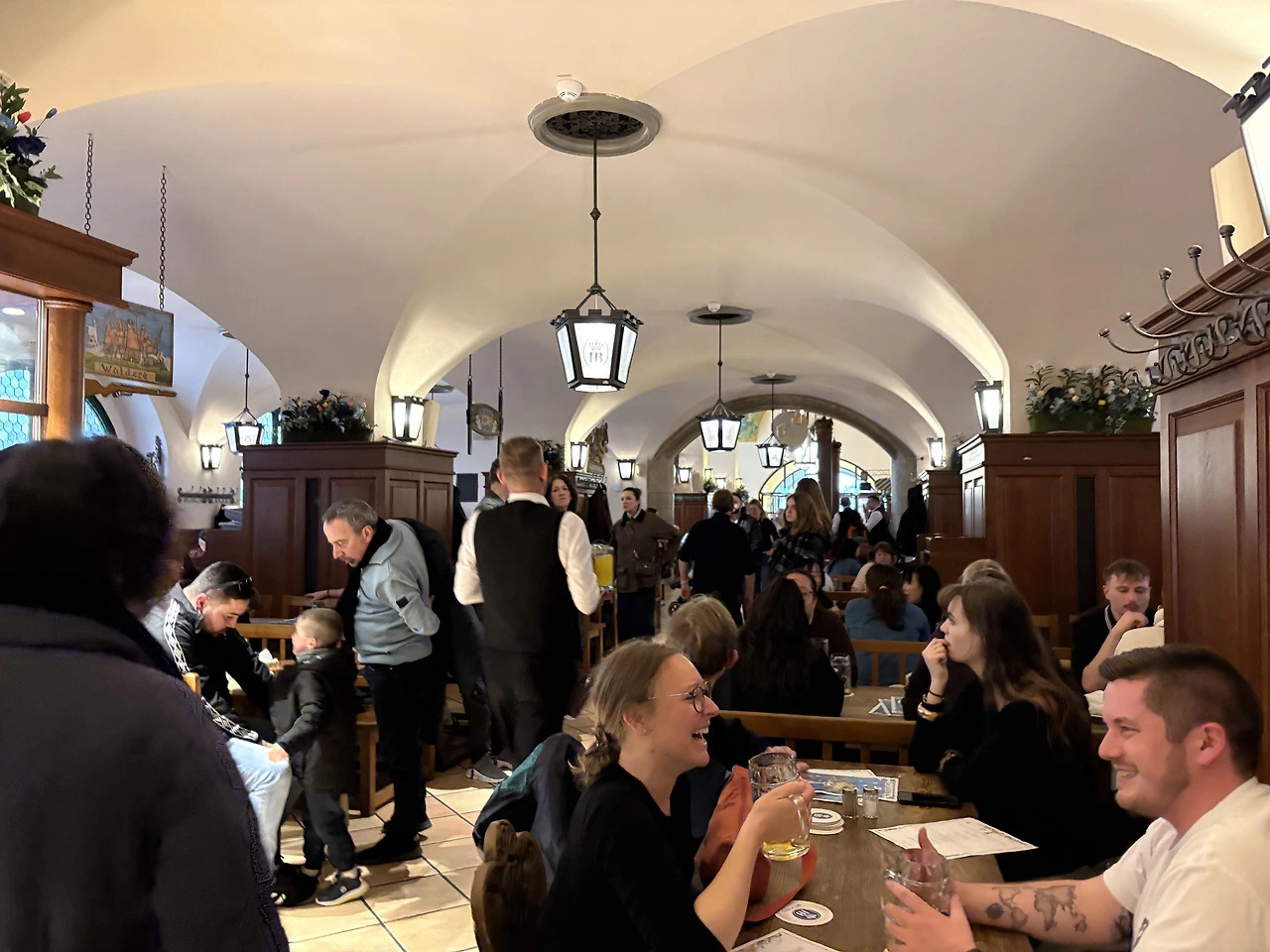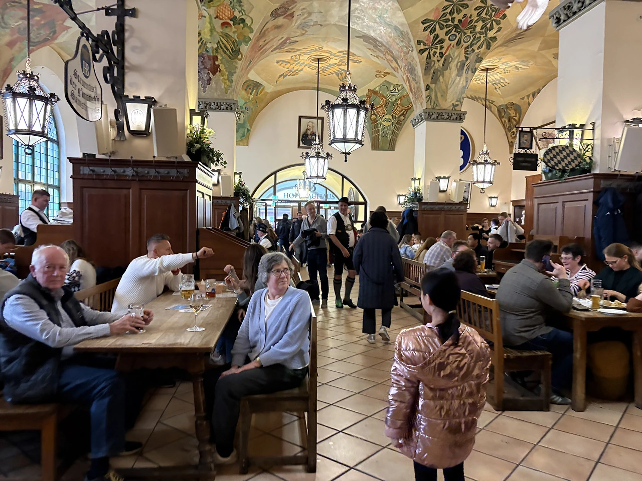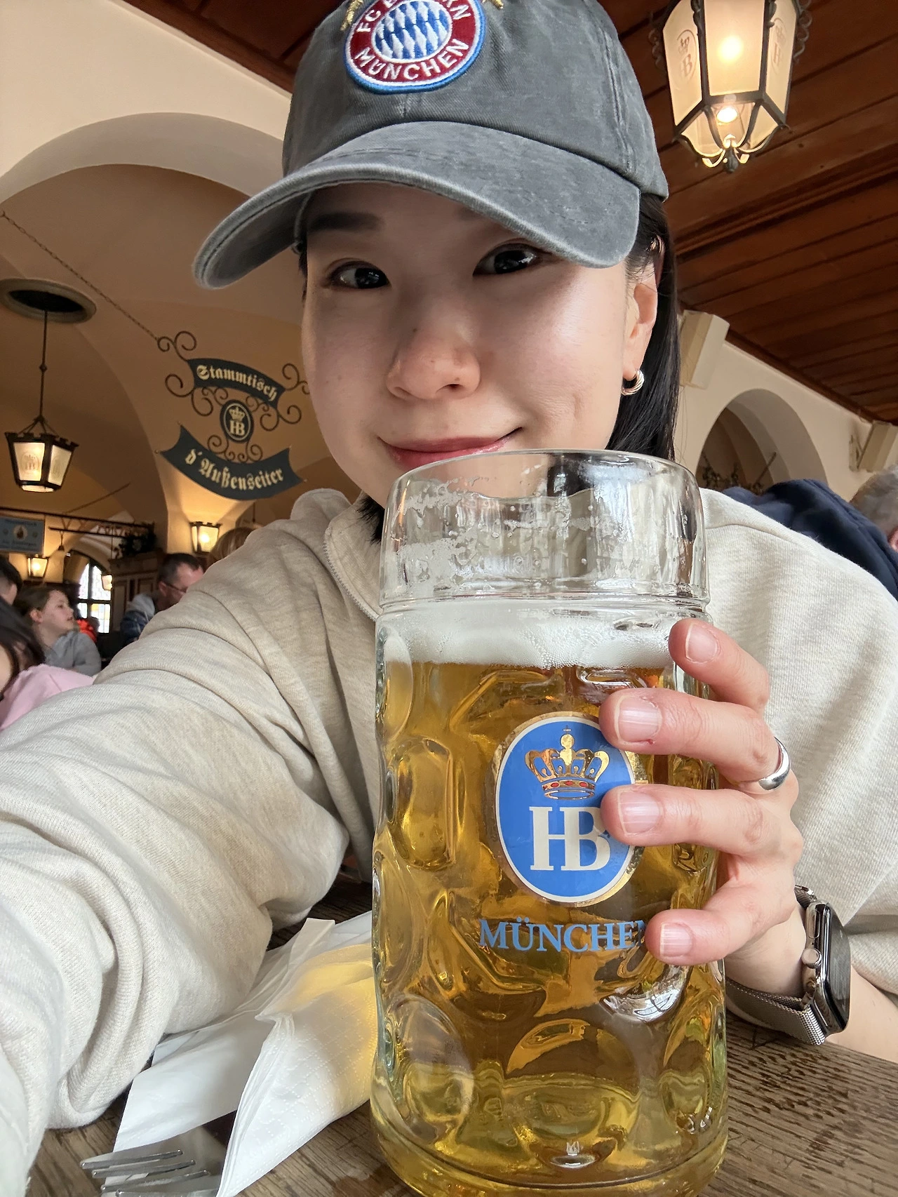 뮌헨하면 축구와 맥주 아닌가..! 광장 근처의 FC 바이에른 뮌헨 굿즈샵에 들어가서 기념 모자를 사고, 뮌헨에 오면 꼭 오고 싶었던 호프브로이하우스로 바로 향했다. 호프브로이는 Hof(궁전) + Bräu(맥주)라는 뜻으로, 바이에른의 공작 빌헬름 5세가 왕실 식구들이 마실 맥주를 직접 만들기 위해 세운 왕실 전용 양조장에서 시작되었다 한다. 옥토버페스트에는 6대 양조장만이 참여할 수 있는데, 그 중 하나가 이 양조장이다. 입구는 그저 규모가 큰 호프집 같았는데, 들어가니 이것은 공중 도떼기 맥주시장(?)도 아니고 뭐라해야 하나..압도적인 규모의 맥주 타운이다. 맥주 반, 사람 반이라고 해도 과언이 아닐 정도로 엄청난 인파를 자랑한다. 별도의 안내 없이 빈 테이블을 찾아 앉으면 그 구역 담당 서버가 주문을 받는 시스템인데, 오후 네 시라는 애매한 시간임에도 빈자리 찾기가 쉽지 않았다. 겨우 자리를 잡고 야심 차게 대충 ’큰‘ 맥주를 주문했는데, 나온 잔은 0.5리터가 아닌 무려 1리터짜리 ‘마스(Maß)’였다. 내 얼굴보다 큰 잔에 담긴 인생 첫 1리터 맥주라니, 뮌헨에서의 첫 브로이하우스 경험치고는 꽤 강렬한 시작이었다.