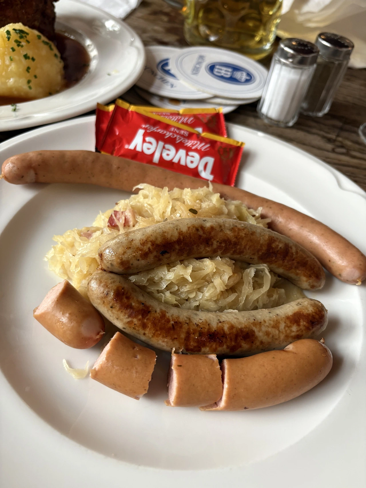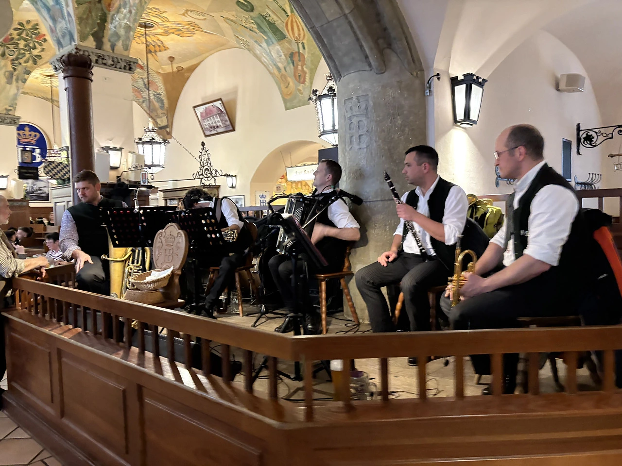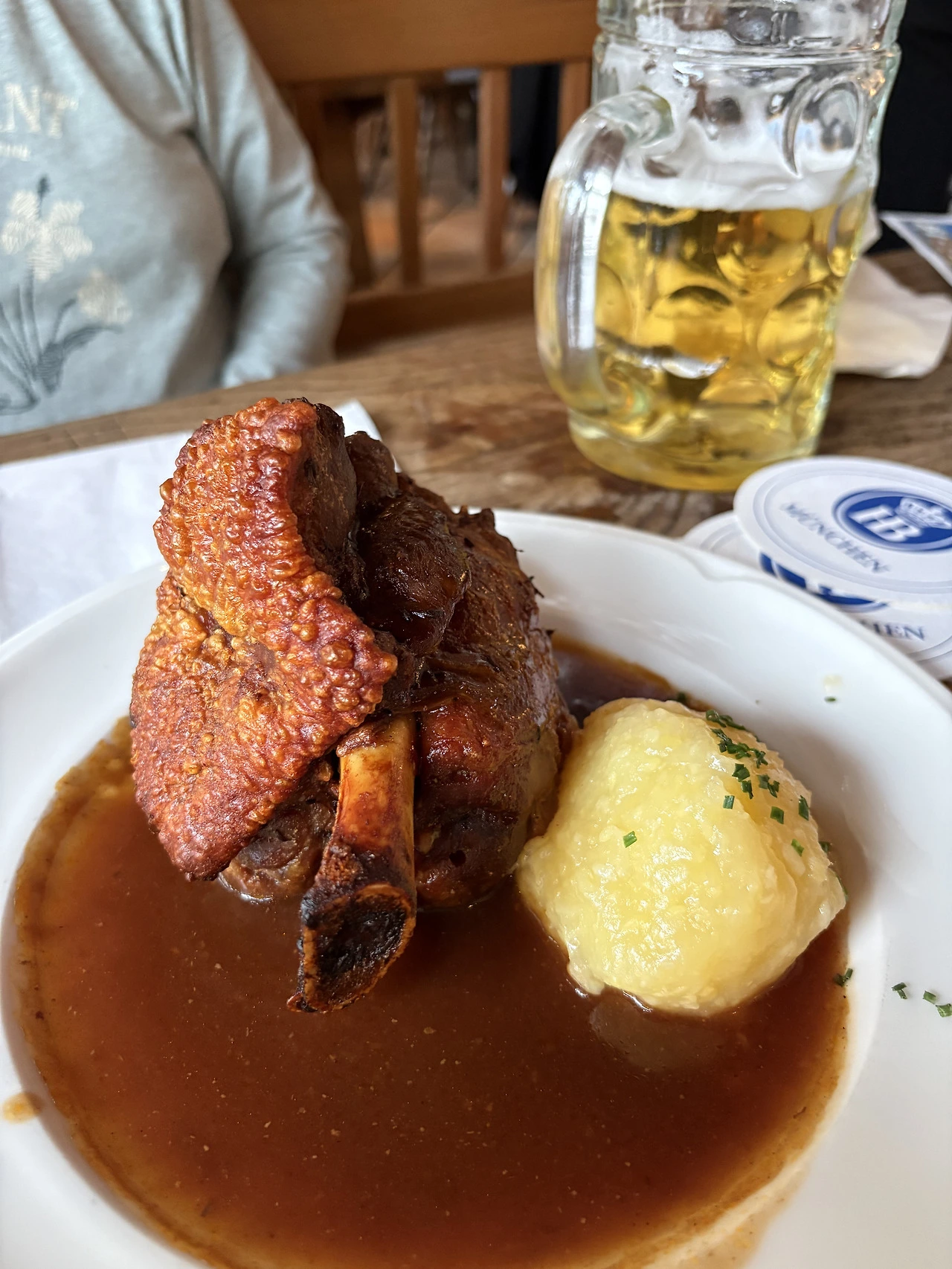 뮌헨하면 축구와 맥주 아닌가..! 광장 근처의 FC 바이에른 뮌헨 굿즈샵에 들어가서 기념 모자를 사고, 뮌헨에 오면 꼭 오고 싶었던 호프브로이하우스로 바로 향했다. 호프브로이는 Hof(궁전) + Bräu(맥주)라는 뜻으로, 바이에른의 공작 빌헬름 5세가 왕실 식구들이 마실 맥주를 직접 만들기 위해 세운 왕실 전용 양조장에서 시작되었다 한다. 옥토버페스트에는 6대 양조장만이 참여할 수 있는데, 그 중 하나가 이 양조장이다. 입구는 그저 규모가 큰 호프집 같았는데, 들어가니 이것은 공중 도떼기 맥주시장(?)도 아니고 뭐라해야 하나..압도적인 규모의 맥주 타운이다. 맥주 반, 사람 반이라고 해도 과언이 아닐 정도로 엄청난 인파를 자랑한다. 별도의 안내 없이 빈 테이블을 찾아 앉으면 그 구역 담당 서버가 주문을 받는 시스템인데, 오후 네 시라는 애매한 시간임에도 빈자리 찾기가 쉽지 않았다. 겨우 자리를 잡고 야심 차게 대충 ’큰‘ 맥주를 주문했는데, 나온 잔은 0.5리터가 아닌 무려 1리터짜리 ‘마스(Maß)’였다. 내 얼굴보다 큰 잔에 담긴 인생 첫 1리터 맥주라니, 뮌헨에서의 첫 브로이하우스 경험치고는 꽤 강렬한 시작이었다.