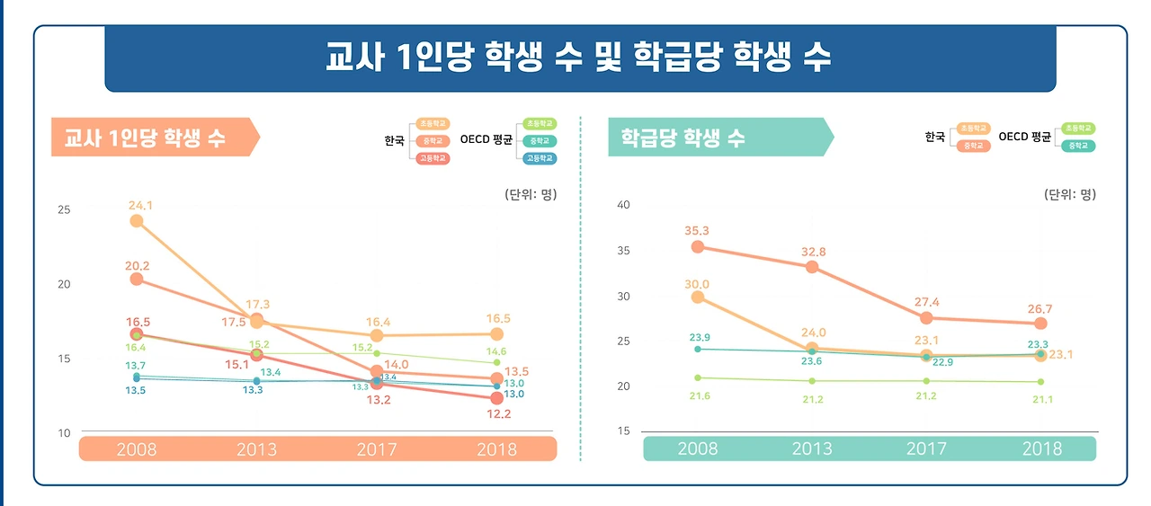 교육부와 한국 교육개발원이 작년 9월 7일에 발표한 자료에 따르면 교사 1인당 학생수, 학급당 학생 수가 과거에 비해 많이 급감하긴 했지만 아직도 OECD 국가 평균에 비교해 볼 때 그 수가 많다는 것을 확인할 수 있다.(초등)