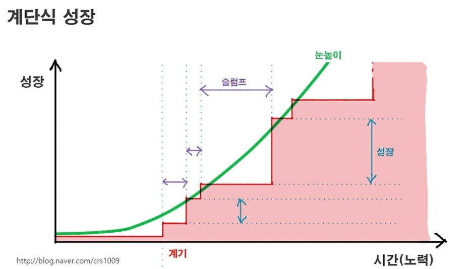 과학시간에 역치라는 것을 배운다. 내가 학창 시절 공부를 하면서 얻었던 삶의 지혜(?)는 바로 이 역치였다. 다른 말로 하면 임계점이라고 표현할 수 있는데, 나의 경험상 공부든 운동이든 어떤 수준에서 다른 수준으로 넘어가기까지에는 반드시 역치의 값을 뛰어넘어야 할 노력이 필요했다. 게다가 그것을 넘어가기까지는 상당한 노력이 뒤따른다. 언제까지인지 알 수 없는 고통과 인내의 시간이 이어지는 것이다. 결코 쉬운 일은 아니다. 하지만 한 번 뛰어넘고 나면 쉬이 내려오지는 않는다. 내 경험에 따르면 한동안 공부를 좀 게을리 해도 성적이 더 오르지는 않았지만 곤두박질치지도 않았다는 것이다. 그리고 그 상태보다 더 높은 결과를 바란다면 더욱 피나는 노력을 해야 했다. 위의 그래프에서 처럼 한 번의 도약이 있으면 한동안은 정체 시기가 오는 것처럼 말이다. 그 기간이 바로 역치를 뛰어넘어야 할 또 다른 노력과 고통의 단계였다. 어쩌면 우리의 삶은 오르지 못할 긴 정체의 시간과 짧은 도약의 기쁨 혹은 행복의 단계를 반복하는 것일지도 모르겠다. ([그래프 출처] 성장 그래프 1- <계단식 성장>|작성자 초이)