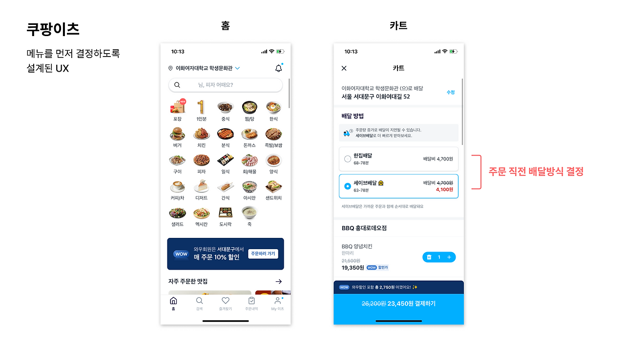 반면 쿠팡이츠의 UX를 살펴보면 홈 화면이 음식 카테고리 위주로 되어있다. 배민과 똑같이 두가지 배달 방식을 제공하는데, 이는 주문 카트에서 주문 직전에 결정하게 된다. 메뉴를 먼저 결정하고 배달방식을 결정하는 UX이다.