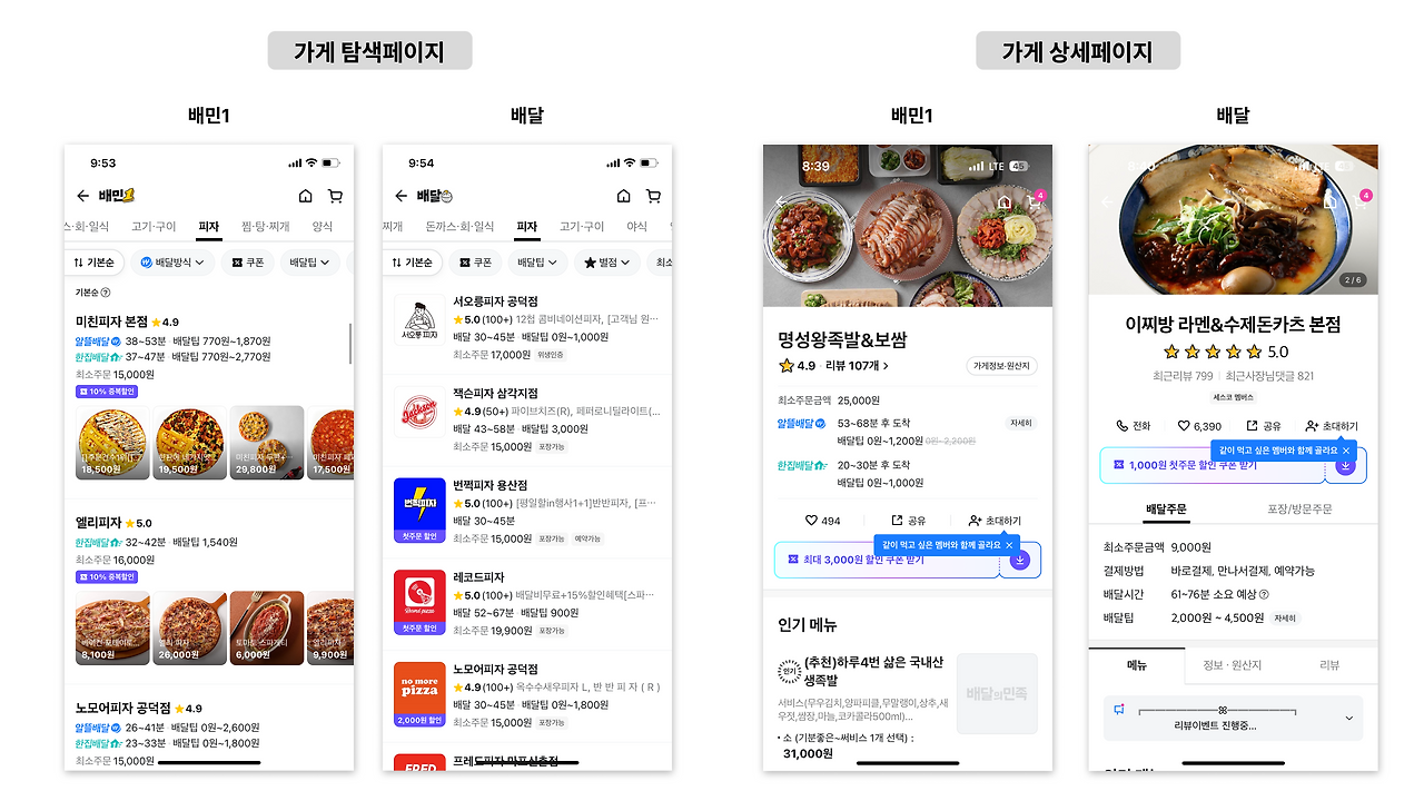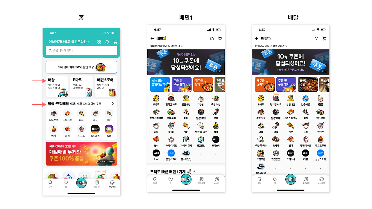 홈화면에 진입해 "배달"을 선택하면 배달페이지로 이동하고, 알뜰,한집배달을 선택하면 배민1 페이지로 이동한다. 아래 두번째, 세번째 UI가 거의 동일해보이지만 왼쪽 상단 제목을 보면 배민1, 배달 페이지로 각각 다른 페이지임을 알 수 있다. 즉 음식 카테고리 페이지로 이동하려면 먼저 배달 방식을 골라야 하는 UX로 설계되어있다.