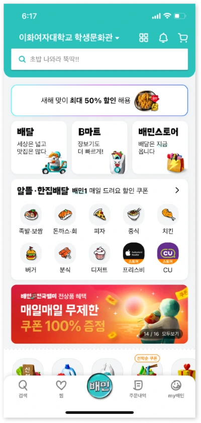 홈화면에 진입하자마자 눈에 보이는음식 카테고리를 선택하는데, 그러면 자연스럽게 배민1페이지로 들어가게 된다. 결국 사용자는 자신도 모르게 배민1으로 주문을 하게 된다.