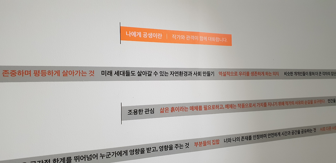 기-승-전과 다르게 결은 작품의 형식 자체가 주제이기 때문에 형식적인 이유로 분류했다. 작품들이 전시 주제의 사전적 정의에서 시작해 개인적인 해석으로 이어지는 연결이 좋았다. 그리고 QR코드를 활용해 전시장의 경험을 관객의 주거 공간까지 확장해서 공간적으로도 전시 주제인 '공생'을 생각해보도록 하는 구성이었다.