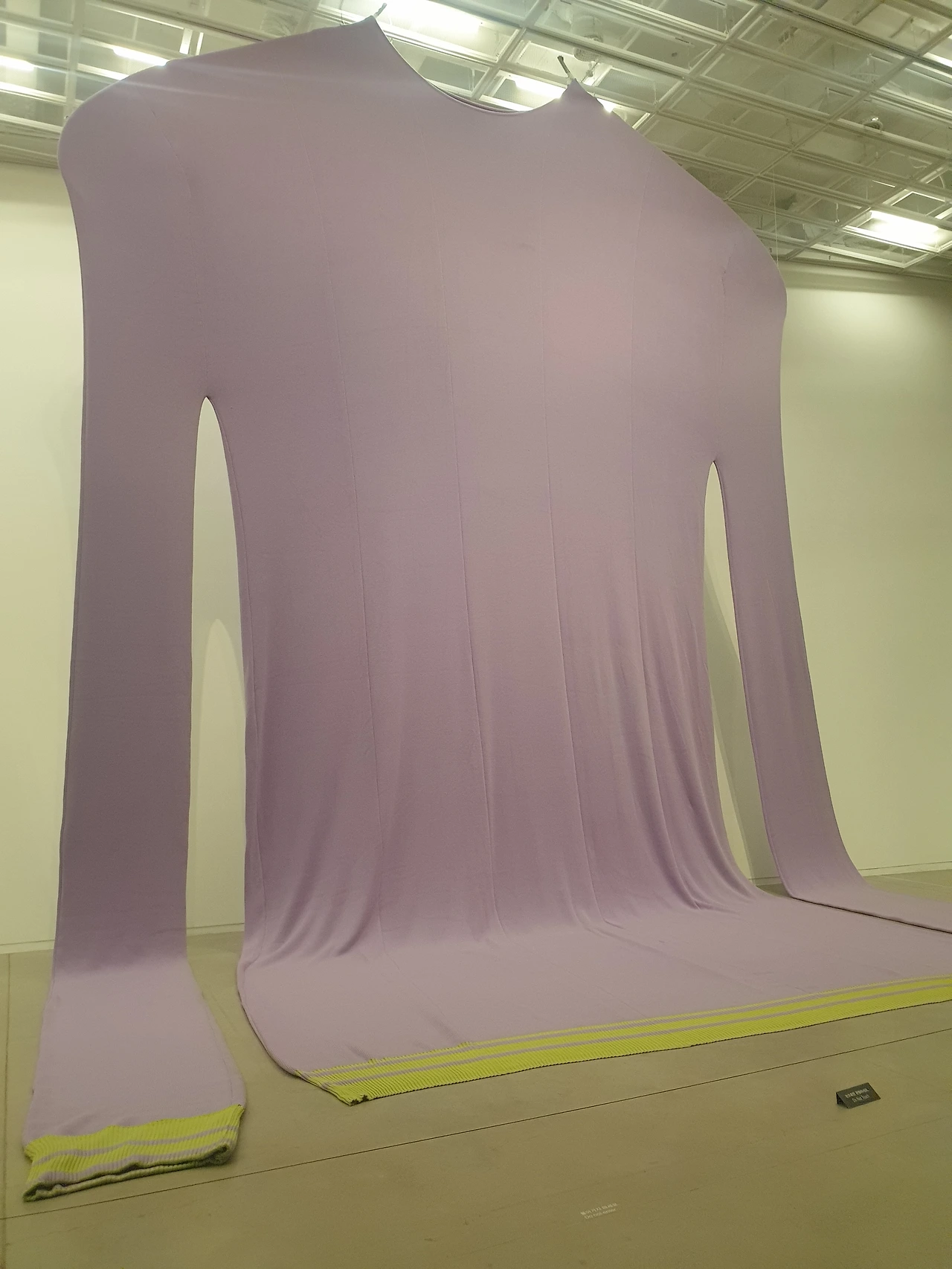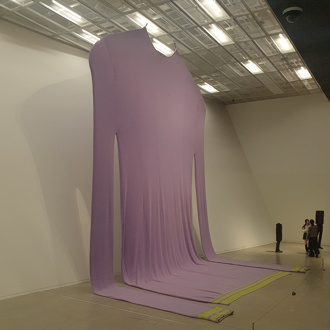 〈사순절 천〉. 전시장 1~2층의 층고보다도 긴 작품으로, 옷과 신체라는 작가의 중심 소재를 거대한 부피감으로 보여준다.
