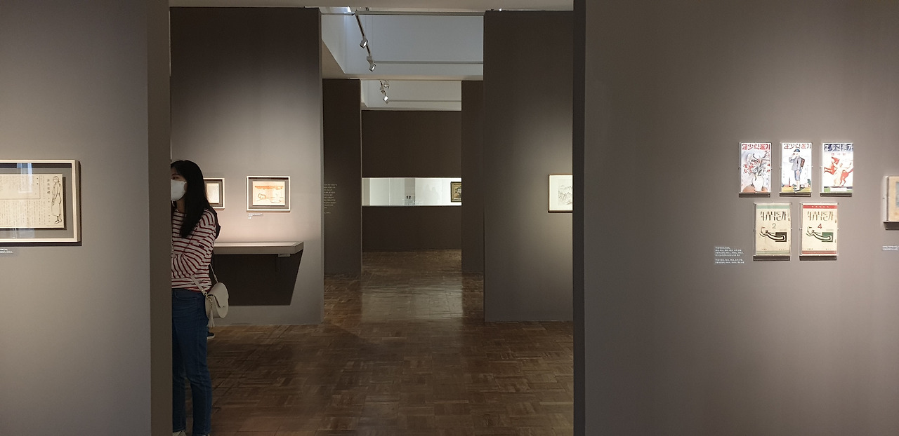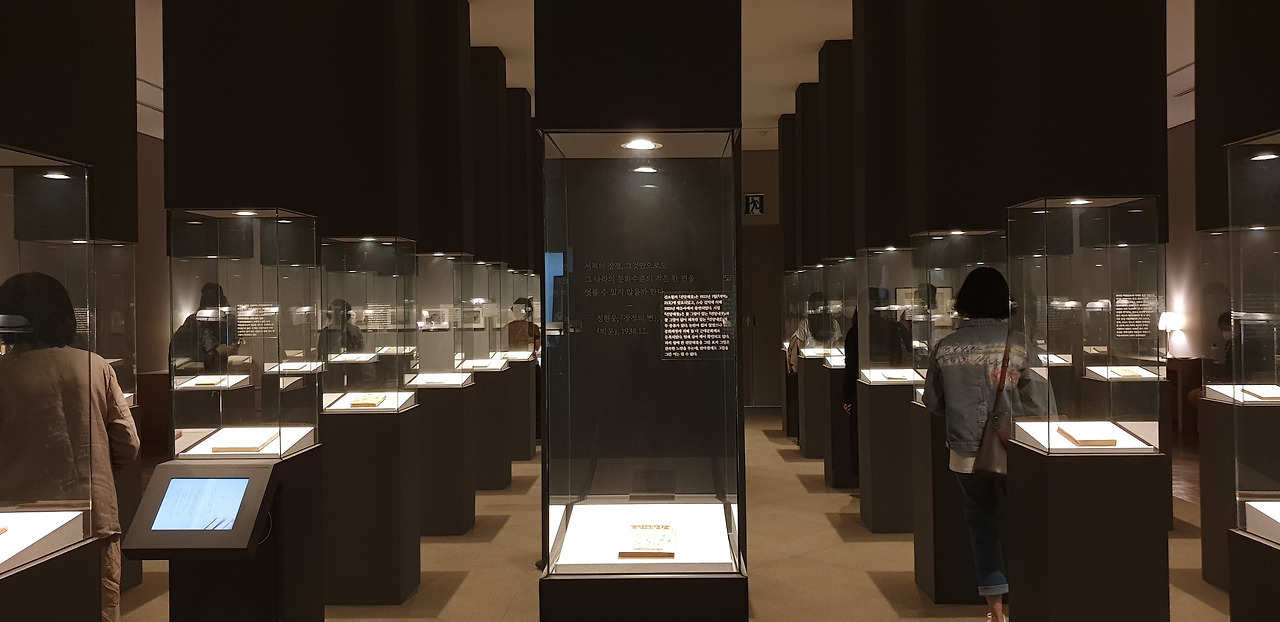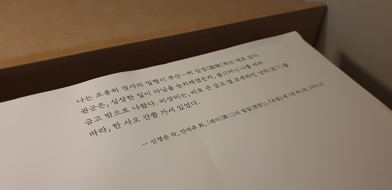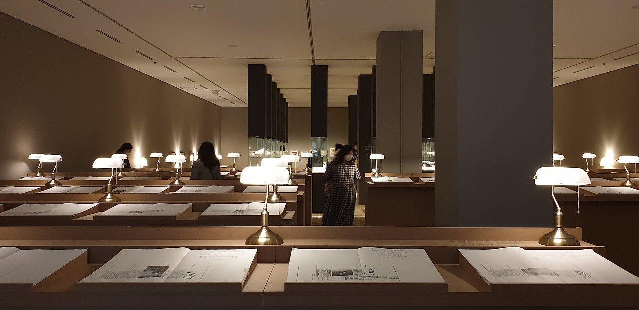 개인적으로 공간과 타이포그래피에 관심이 많아서 전시 제목을 보고 문학을 어떻게 공간으로 풀어냈을지 무척 궁금했다. 주말에는 국현(국립현대미술관) 예약이 꽤 힘든데, 아침부터 취소표를 기다리다가 운 좋게 한자리가 비어서 전시가 끝나갈 때 즈음 간신히 다녀왔다. 이번 전시는 1930~40년대 조선에서 서양 문화를 받아들였던 경성 예술가들의 작품을 그들의 관계를 중심으로 다루고 있다. 국현 덕수궁관은 가운데 중정을 두고 2, 3층 양옆에 전시장이 있어 대체로 4부로 전시가 구성된다. 이번 전시도 마찬가지였는데, 전시장마다 다른 방식으로 책을 경험할 수 있어서 공간에 들어설 때마다 새로운 느낌이 들었다.
